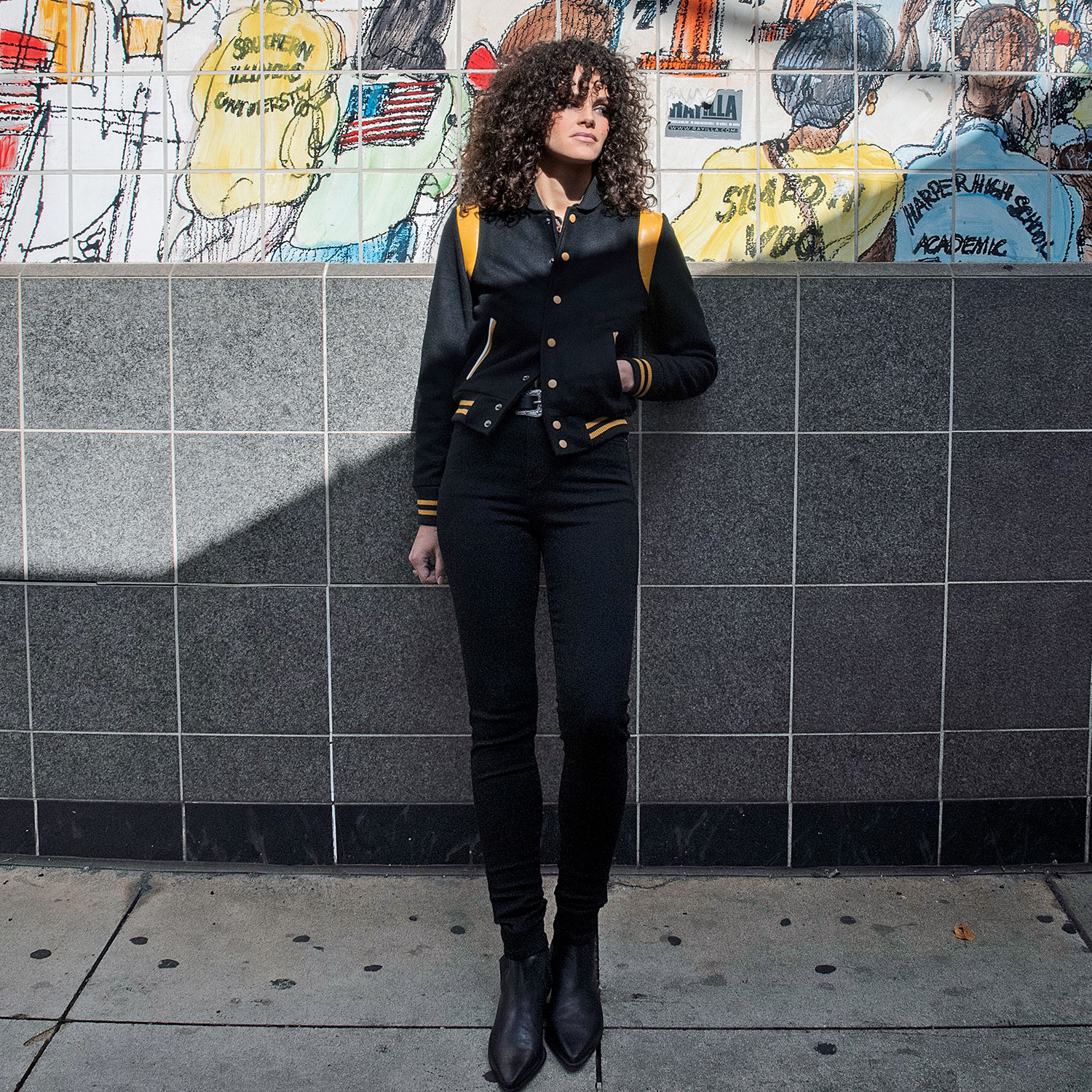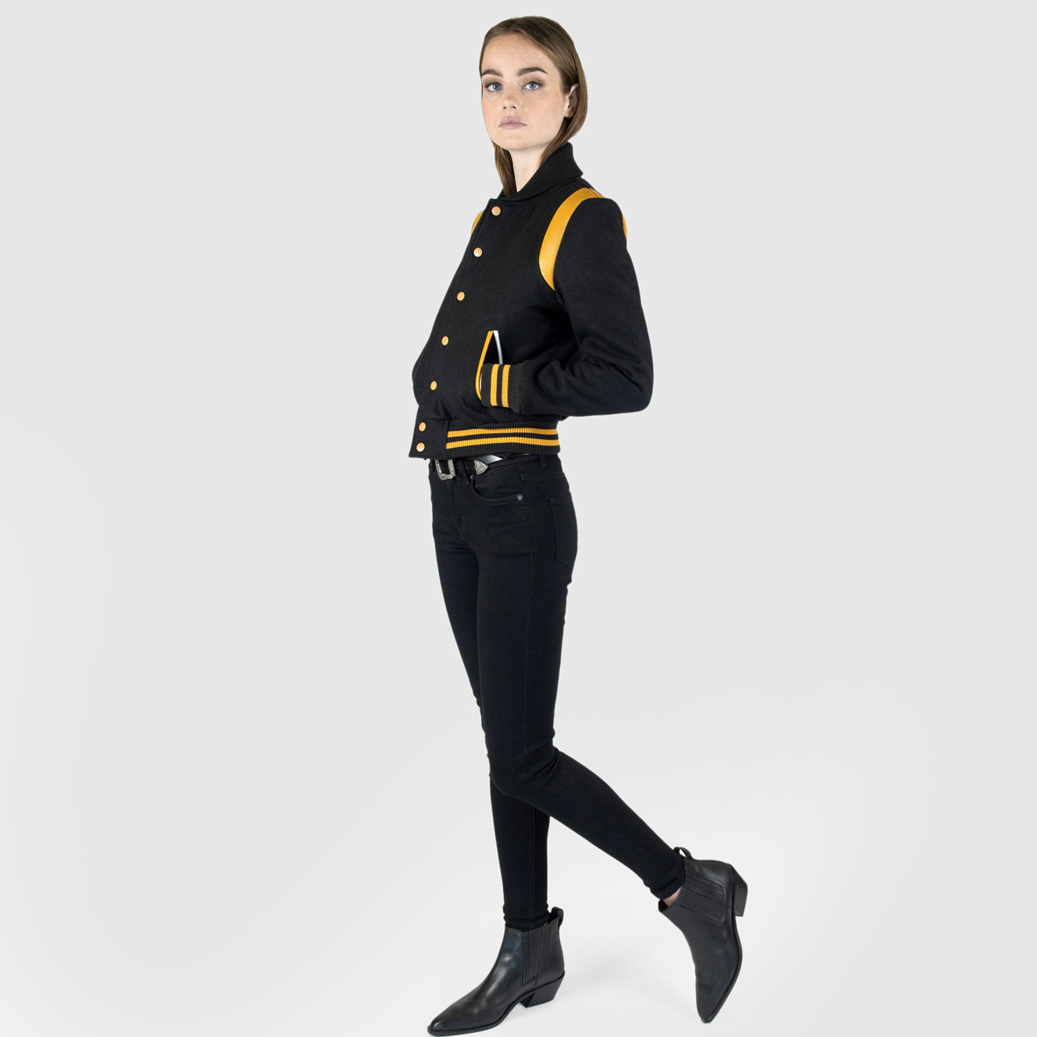 Fitted varsity jacket, wool-blend, snap closure, and shoulder details. Durable elastic cuffs, waistband and fold-down collar. Yellow and white pocket trim. Unisex sizing.