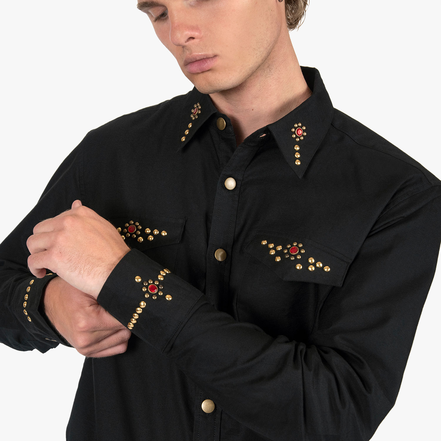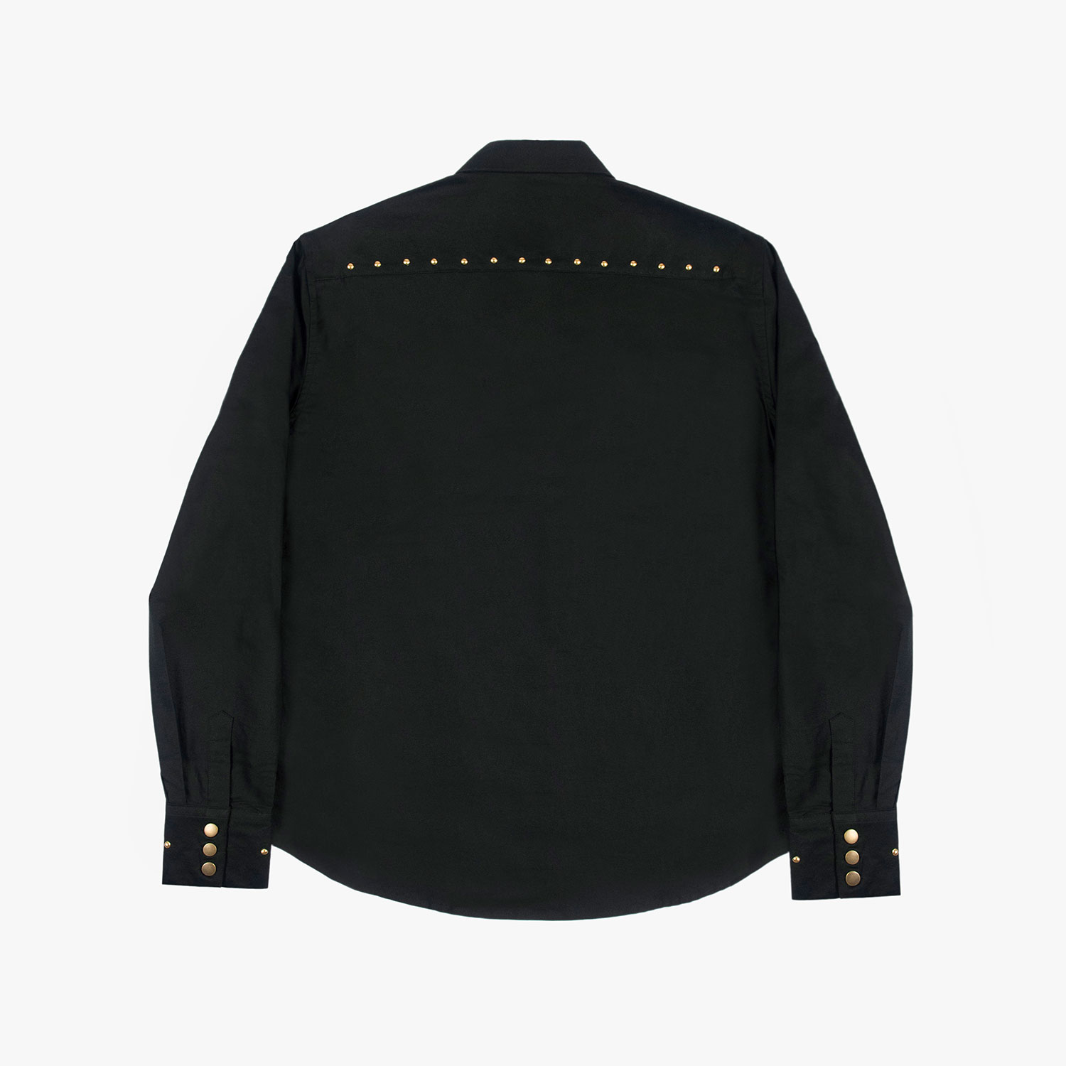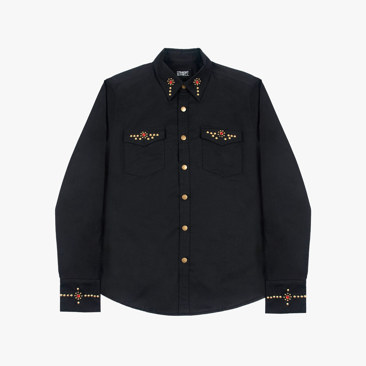 The Brux features brass and gem studs along the collar, chest pockets, cuffs, and back. Hand studding. Brass button closure. This is our new True fit.