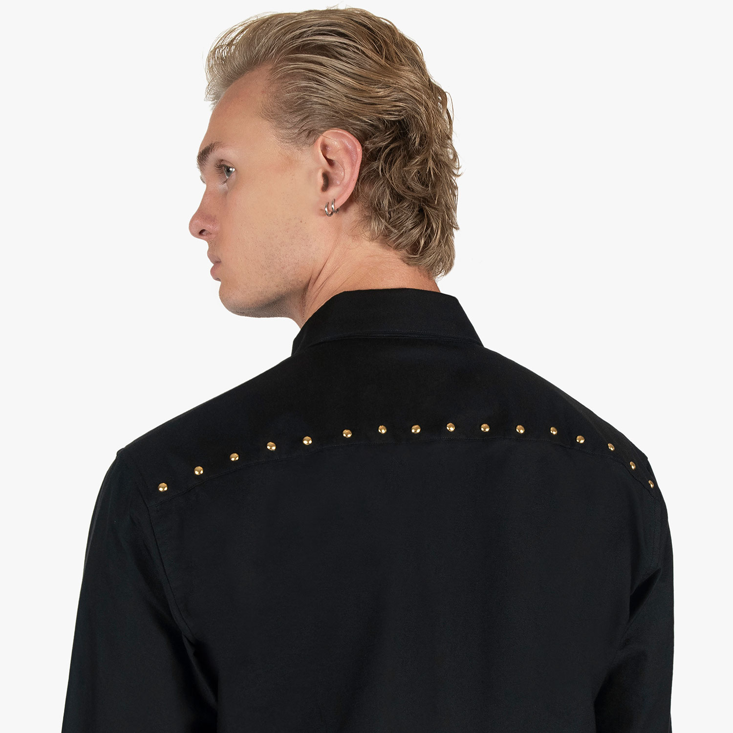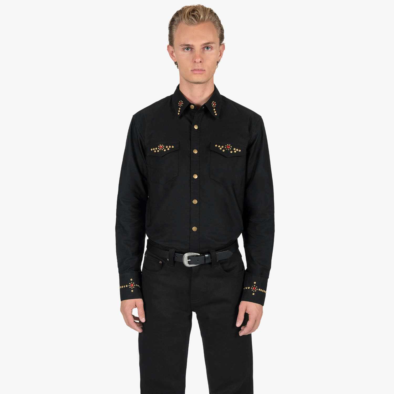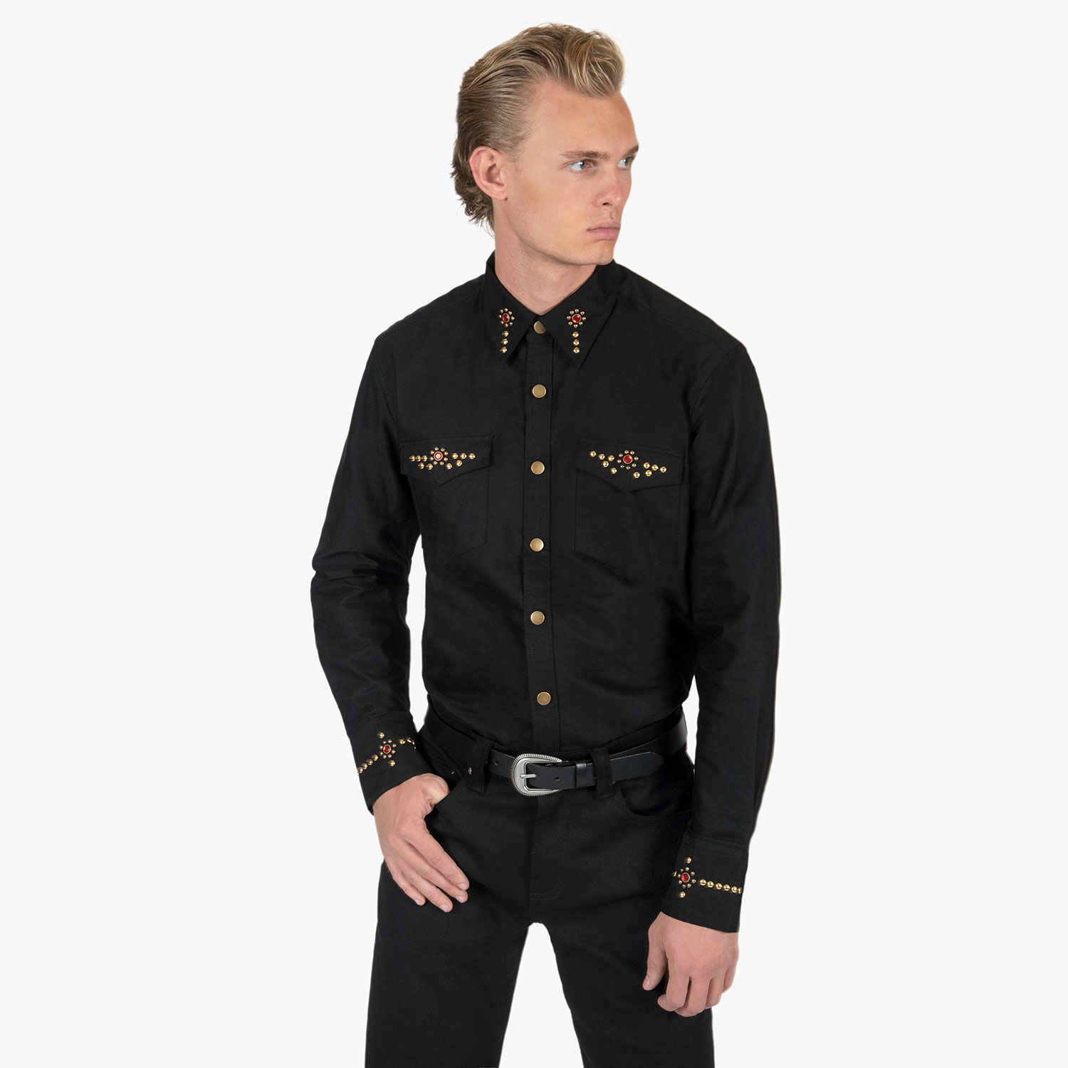 The Brux features brass and gem studs along the collar, chest pockets, cuffs, and back. Hand studding. Brass button closure. This is our new True fit.