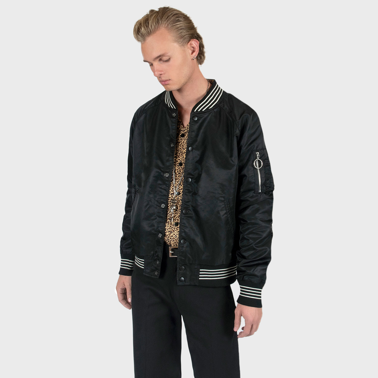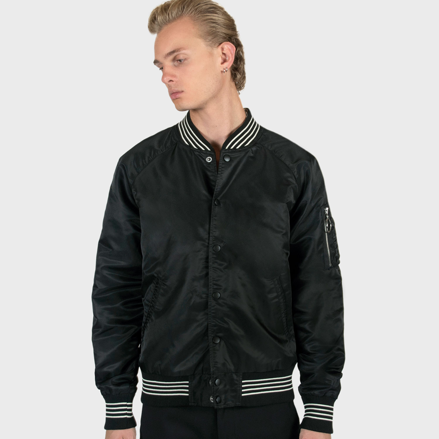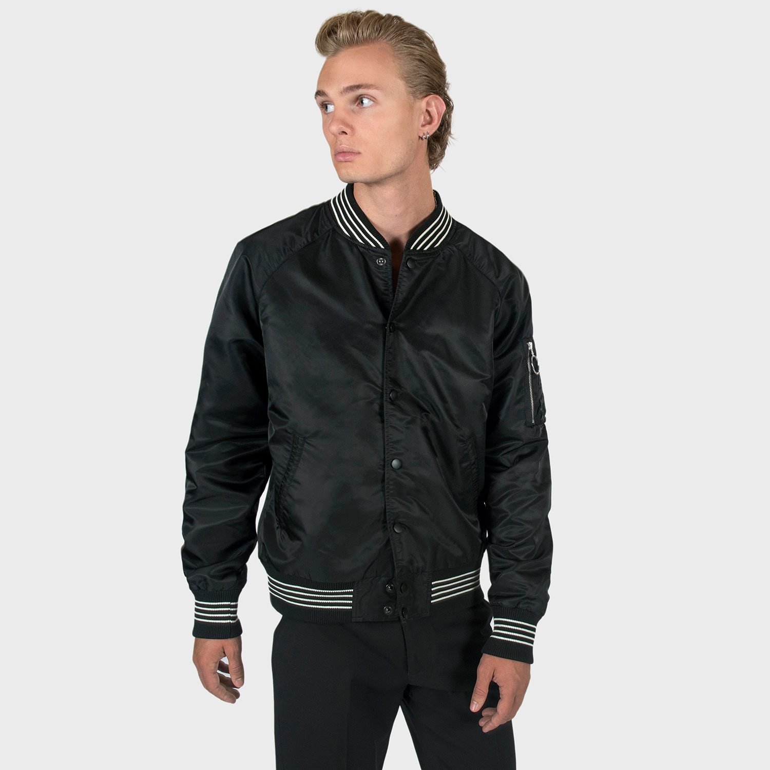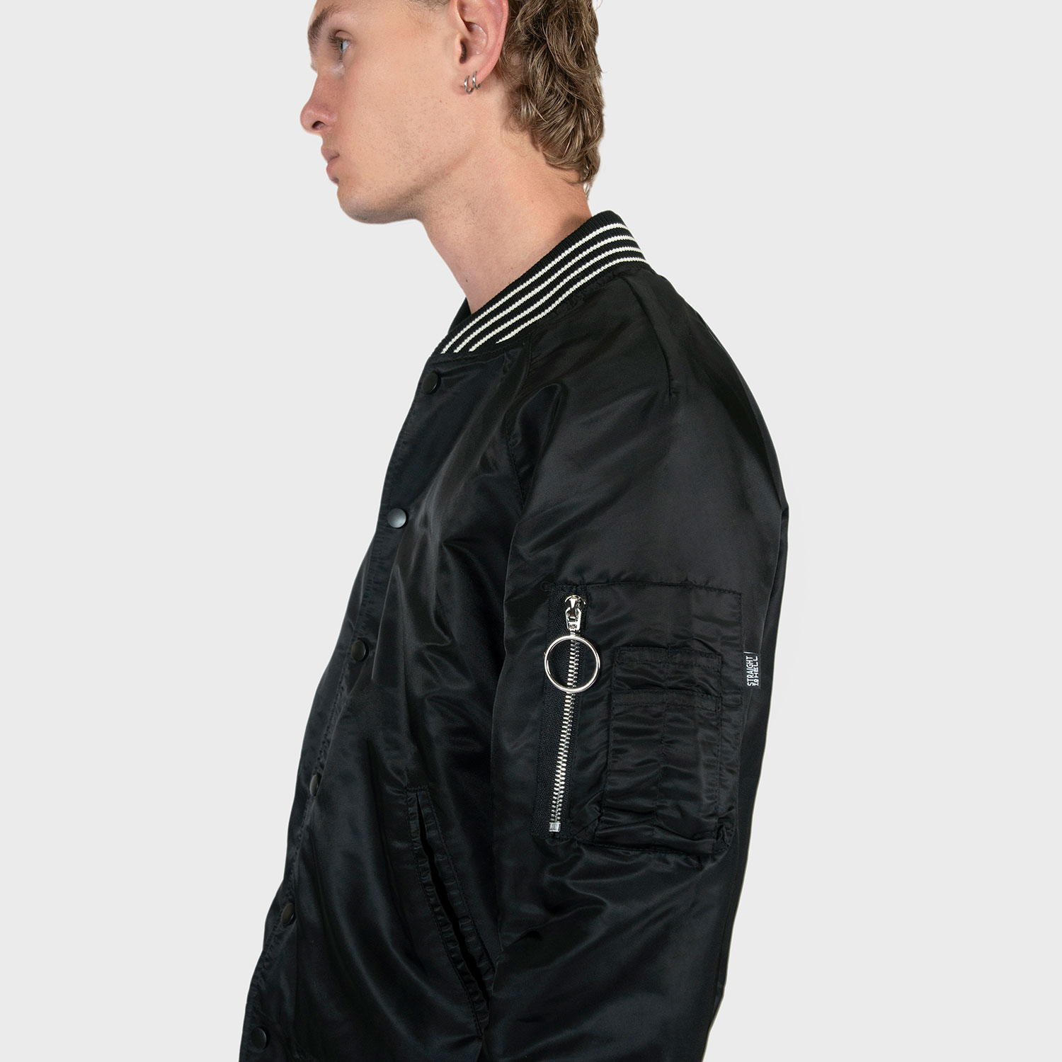 The Club of One stylishly blends the varsity jacket with the bomber jacket. Nylon shell, striped elastic bands, bicep utility pocket with O-ring, and snap closure. This is our new Proper fit.