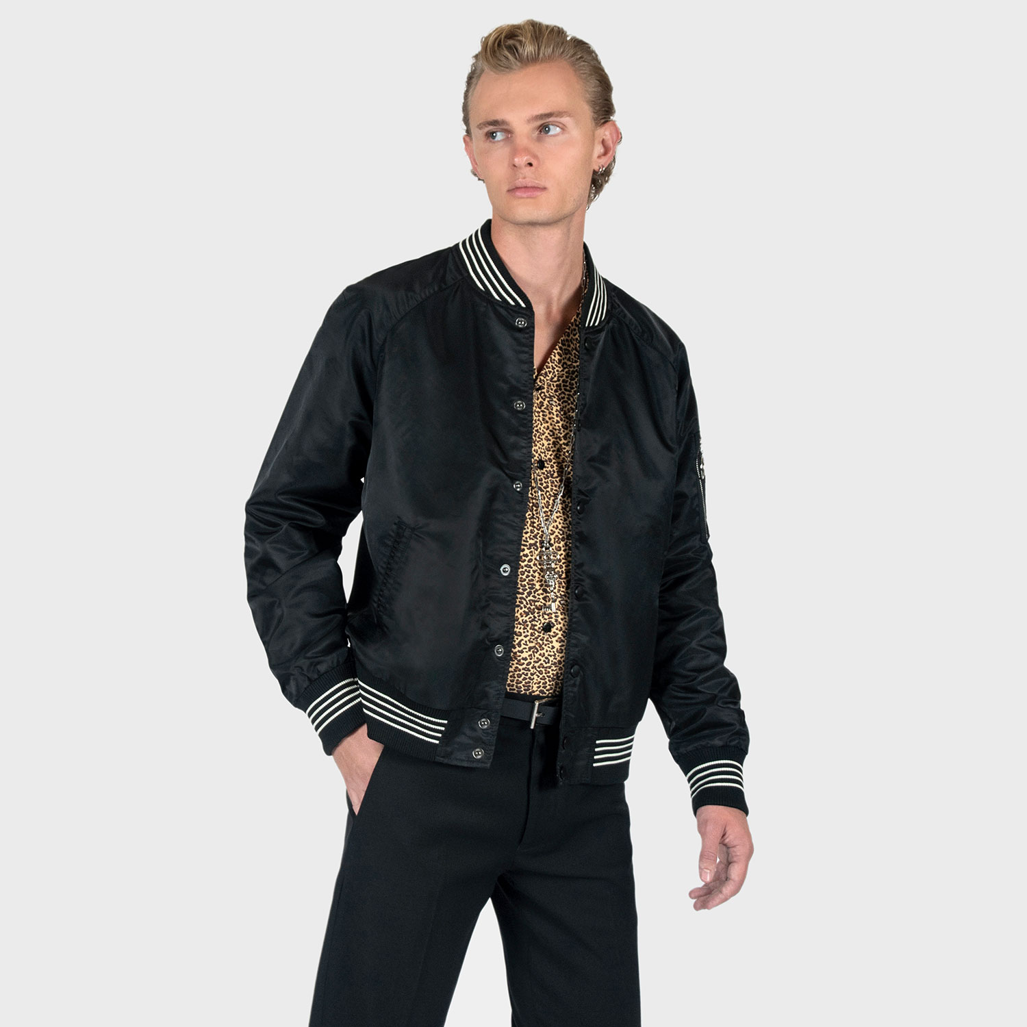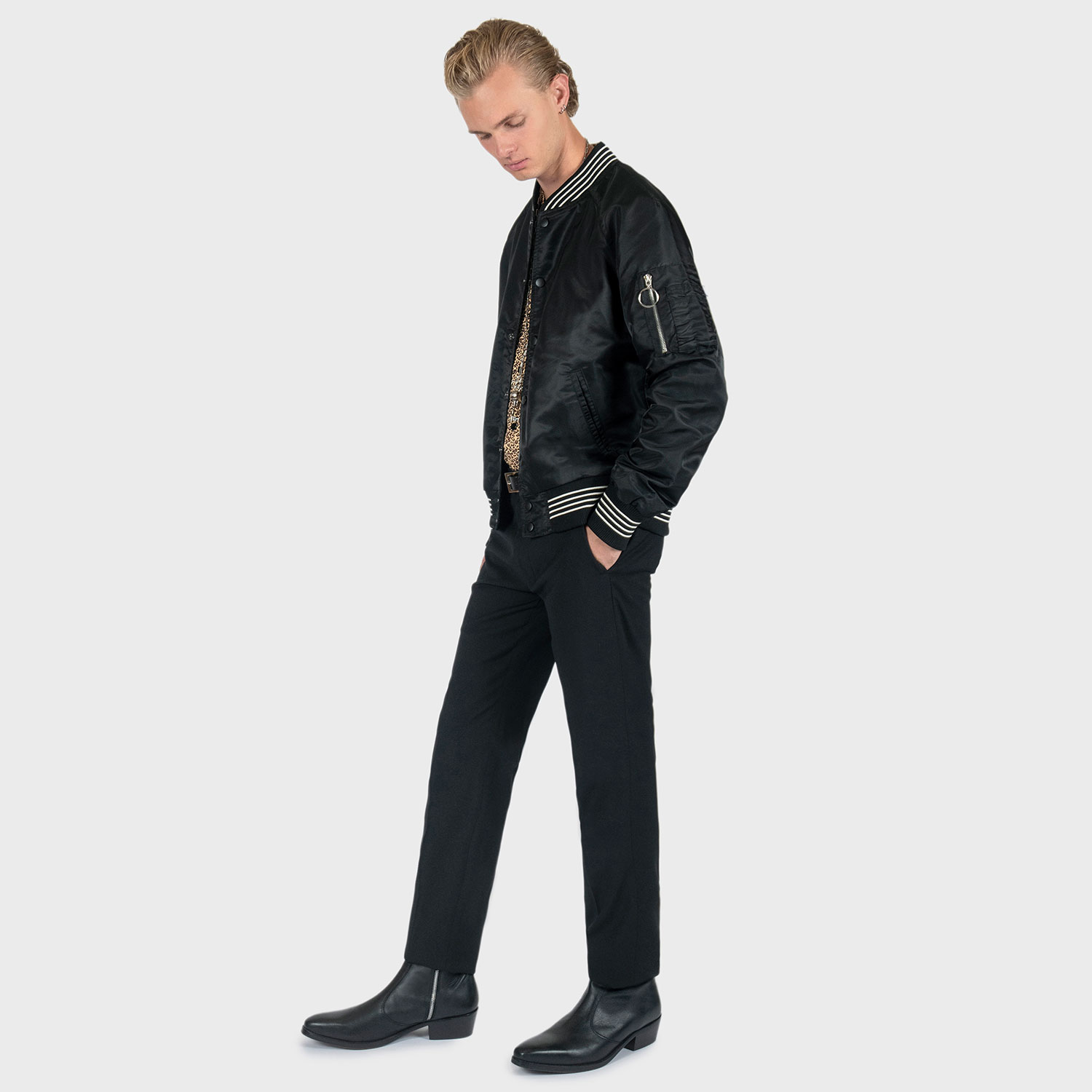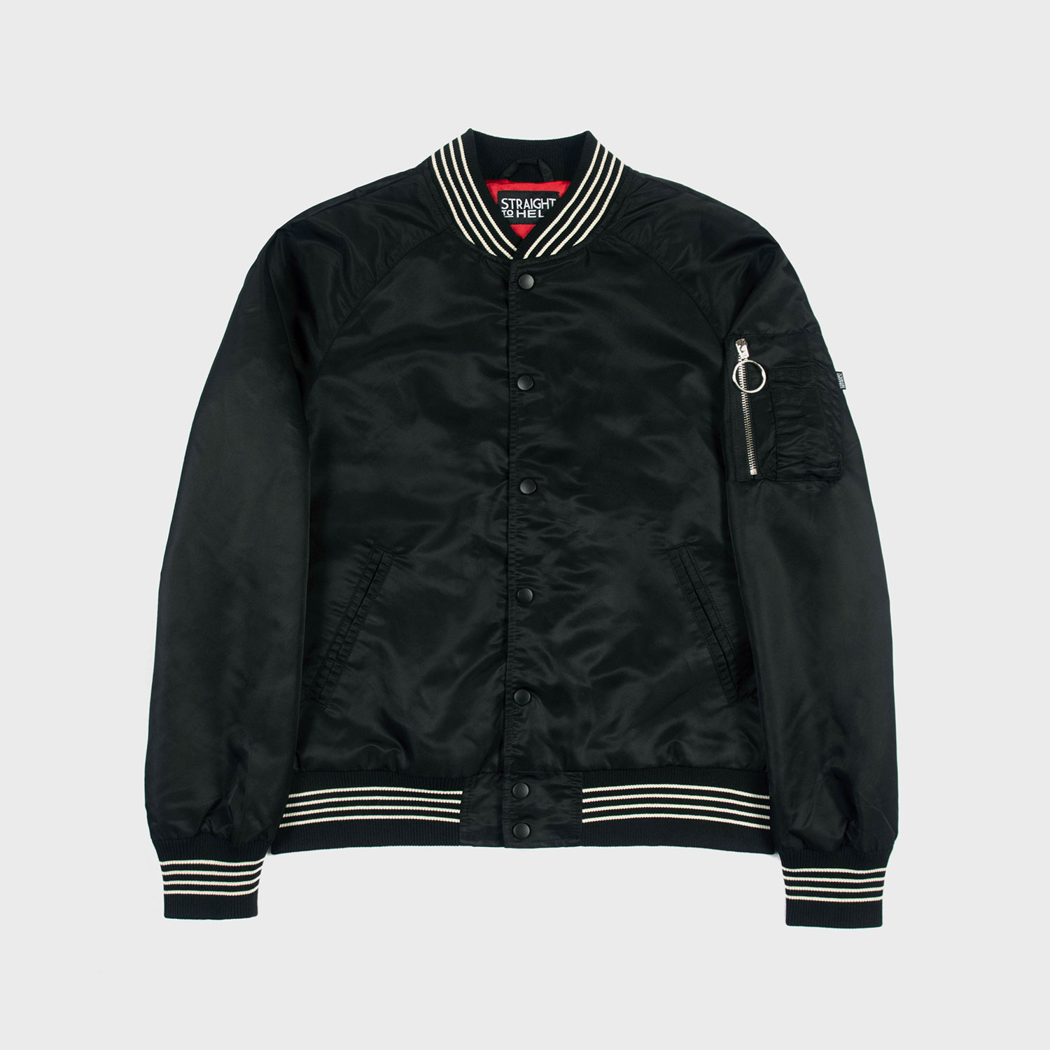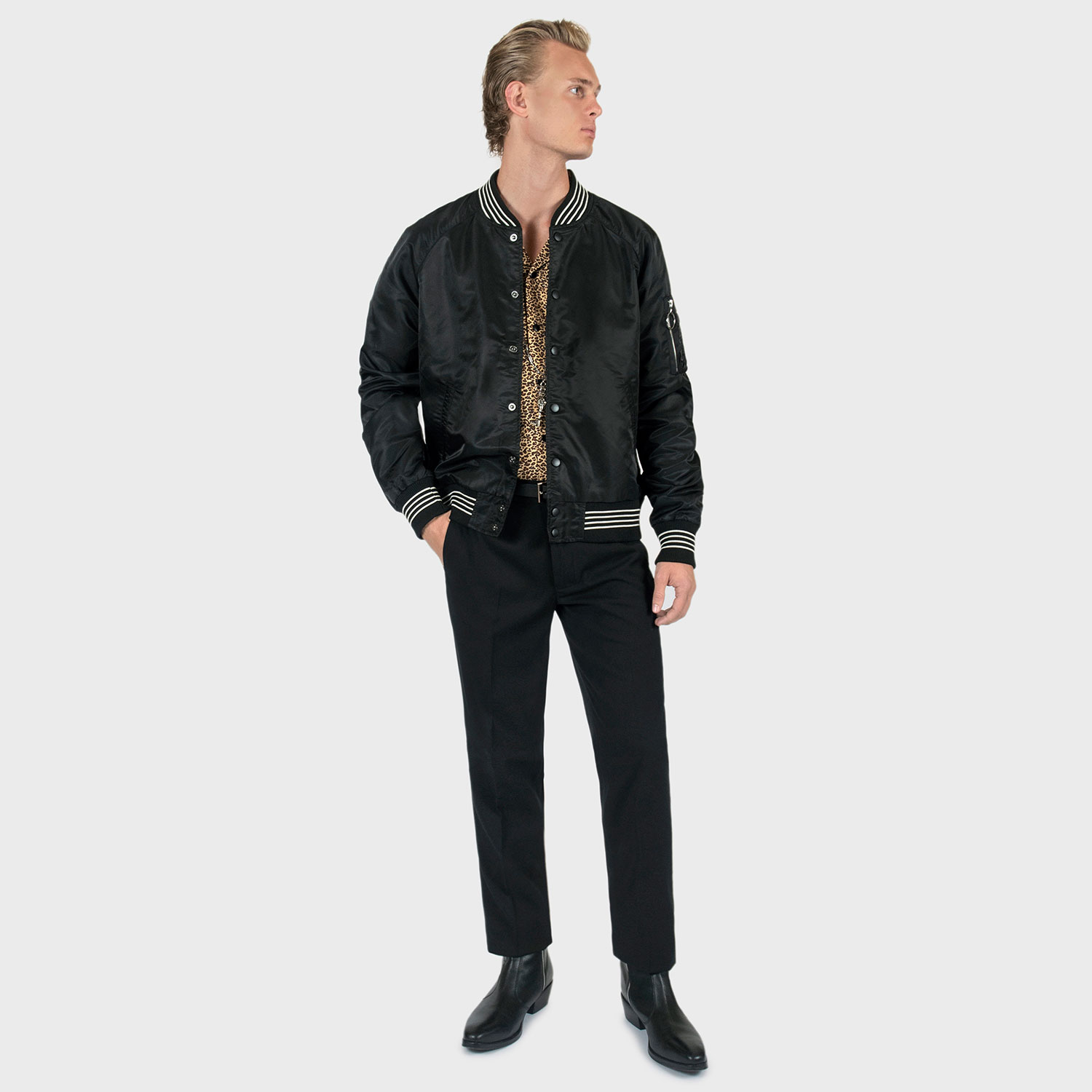 The Club of One stylishly blends the varsity jacket with the bomber jacket. Nylon shell, striped elastic bands, bicep utility pocket with O-ring, and snap closure. This is our new Proper fit.