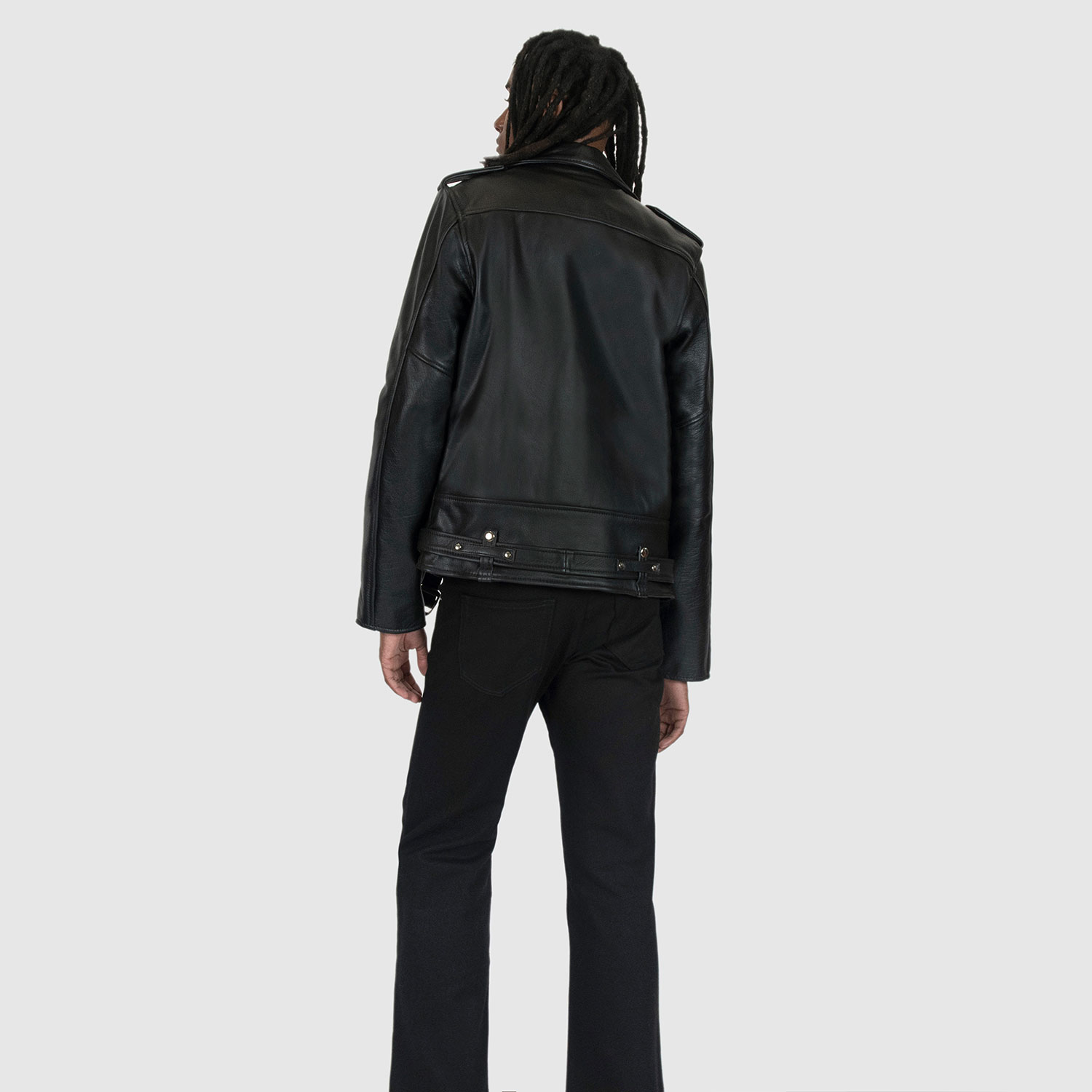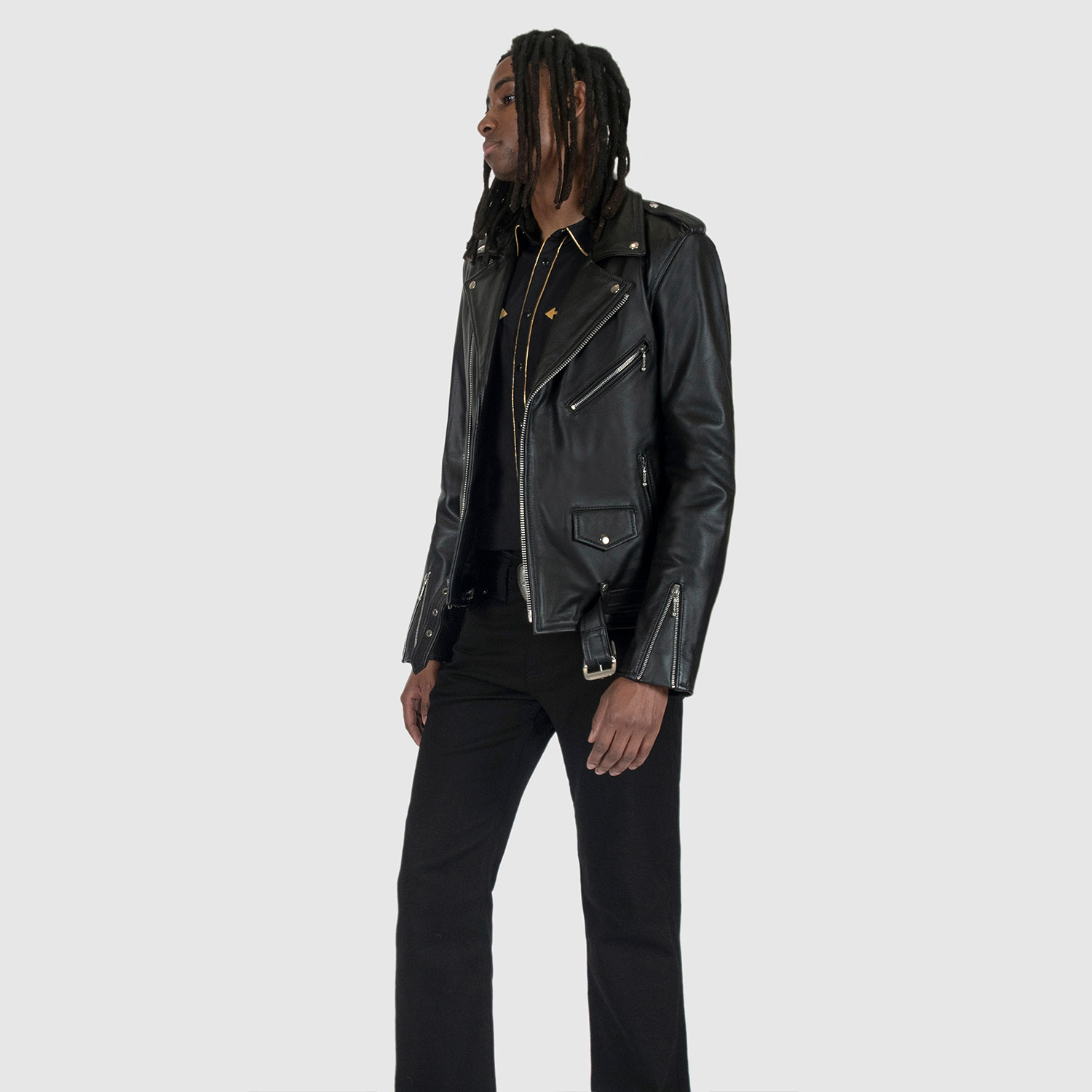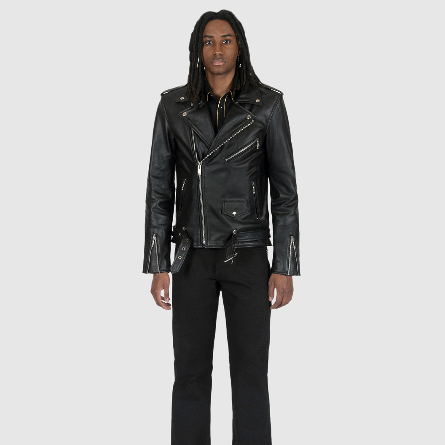 The Commando is our most traditional and recognizable leather jacket. The Commando Long fits longer in the body and sleeves, ideal for tall men. This is our new Modern fit. It features black leather with silver ball pull zippers and redesigned removable belt. Premium leather relaxes and conforms to your shape and breaks in perfectly.