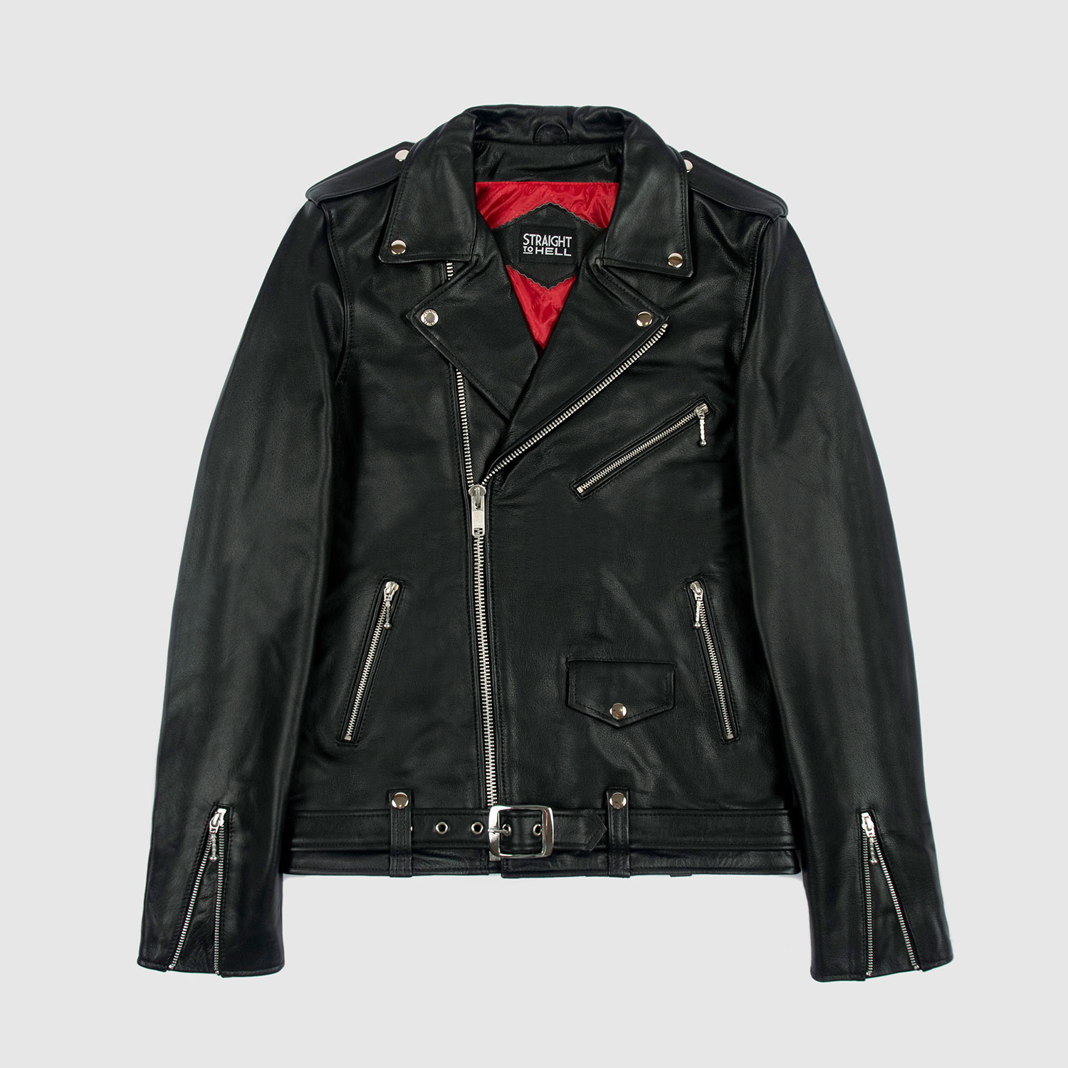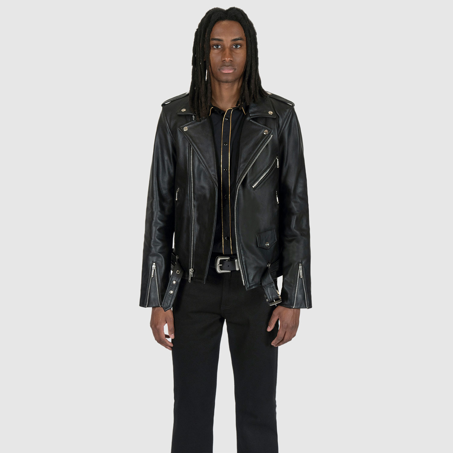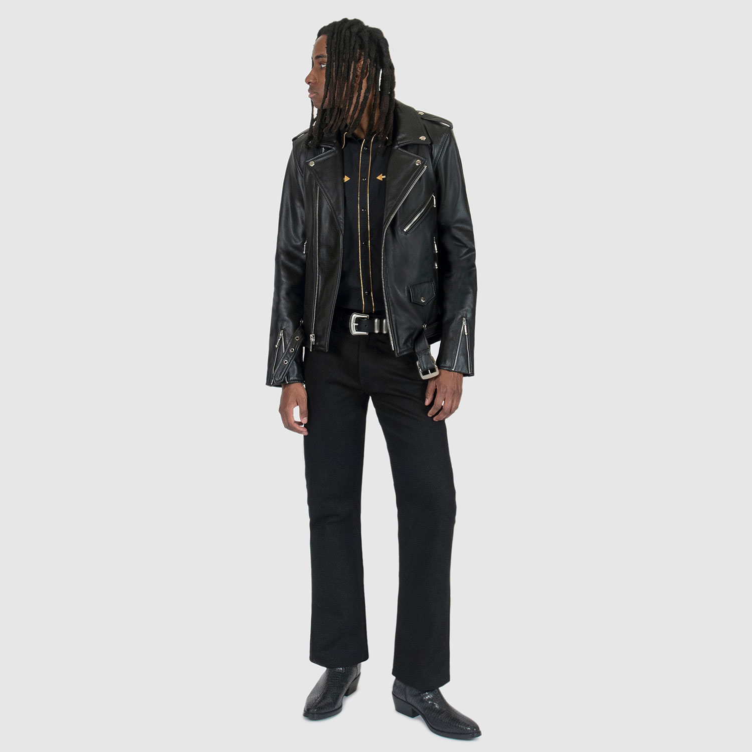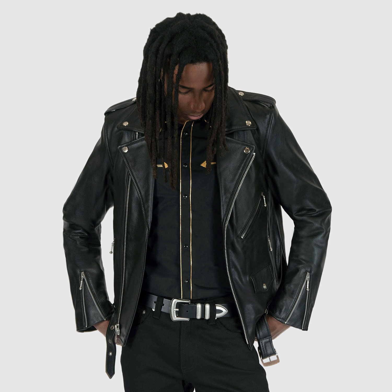 The Commando is our most traditional and recognizable leather jacket. The Commando Long fits longer in the body and sleeves, ideal for tall men. This is our new Modern fit. It features black leather with silver ball pull zippers and redesigned removable belt. Premium leather relaxes and conforms to your shape and breaks in perfectly.