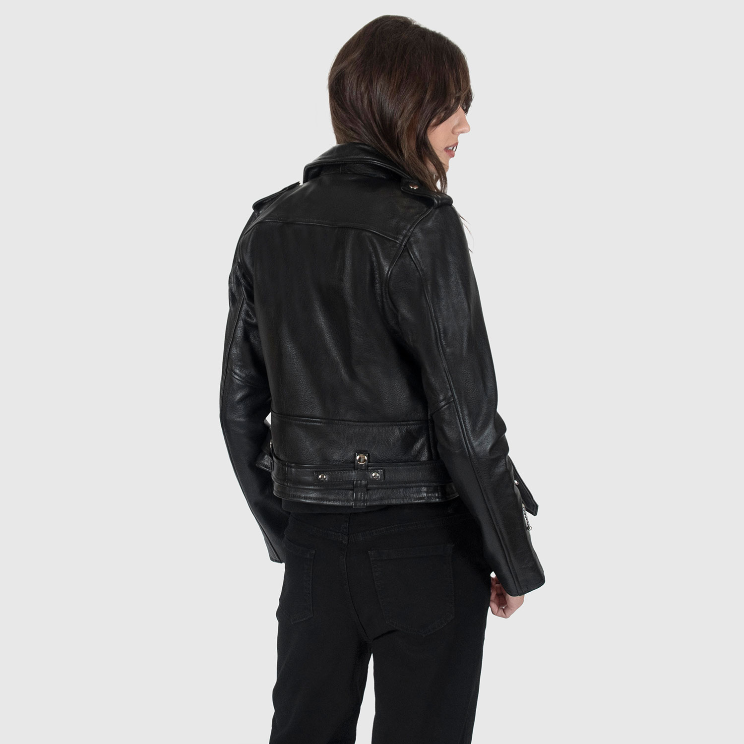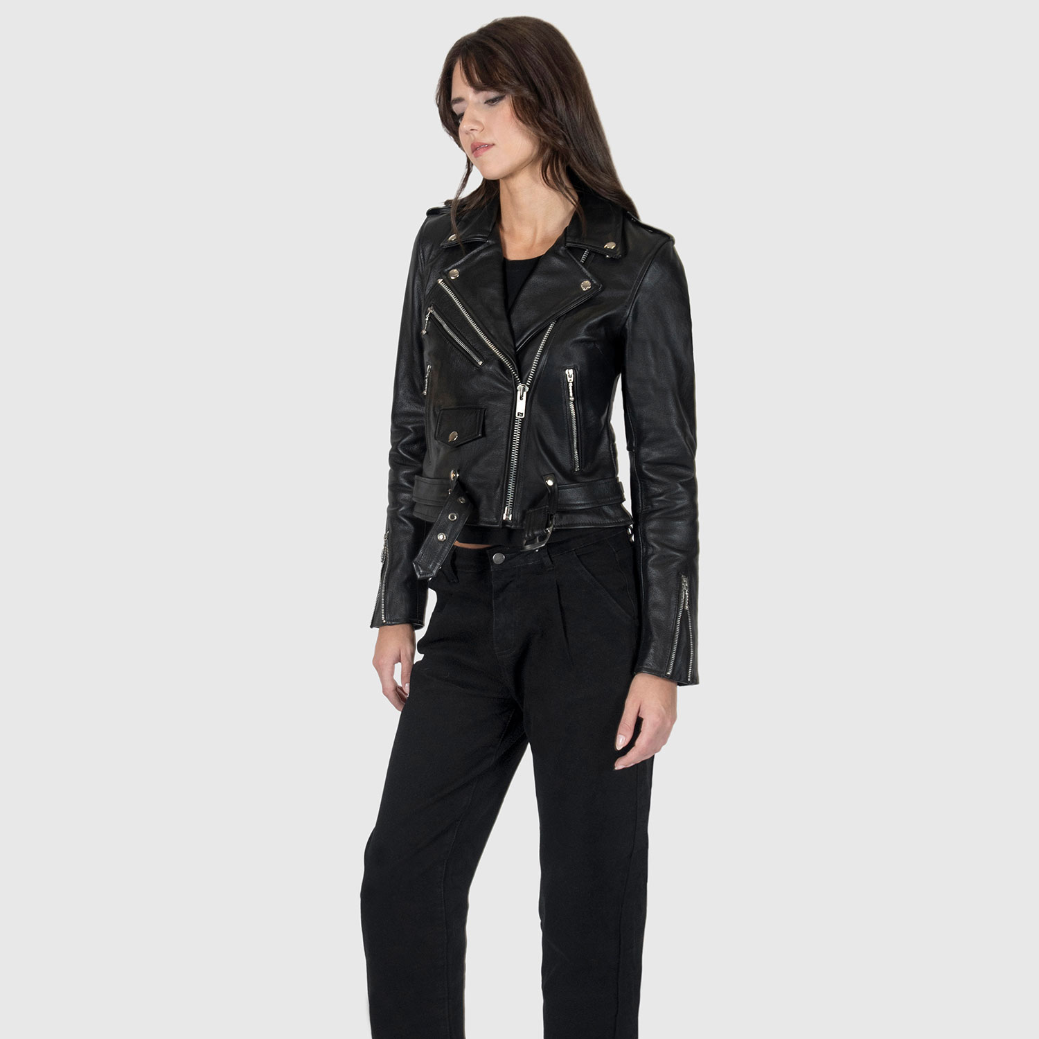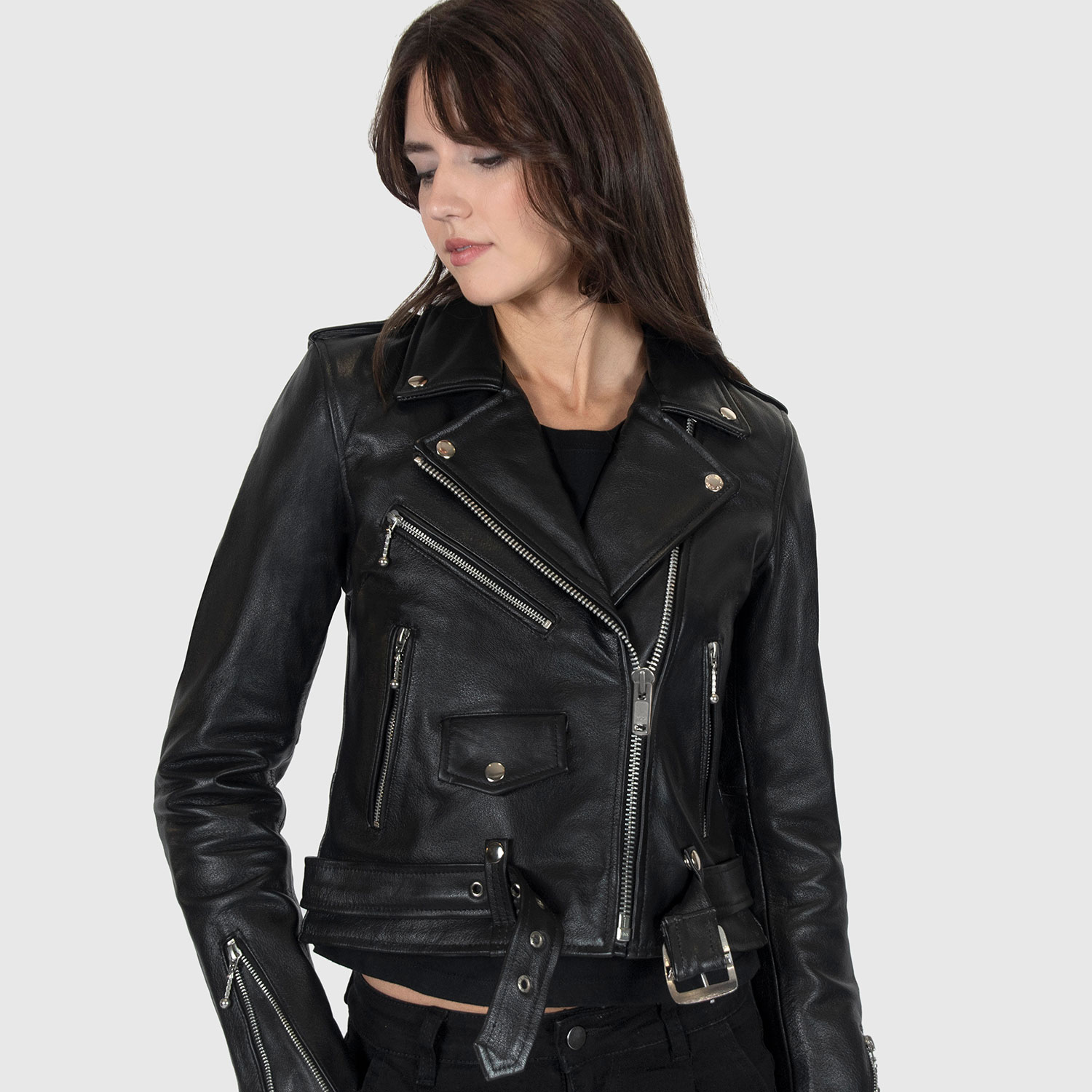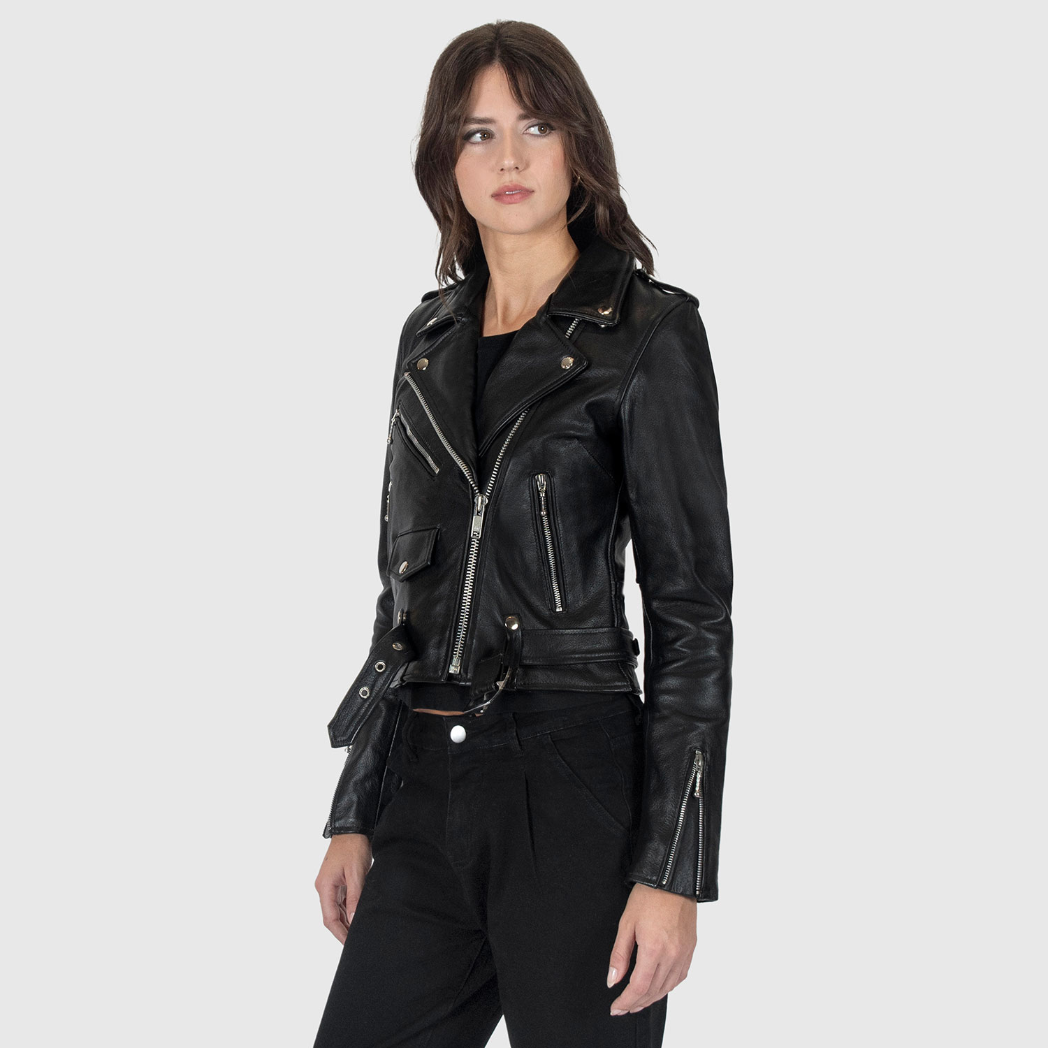 The Commando is our most traditional and recognizable leather jacket. The Commando Long features longer sleeves, ideal for tall women. Black leather with silver, ball pull zippers and redesigned, removable belt. Premium leather relaxes and conforms to your shape and breaks in perfectly. This is our new Modern fit.
