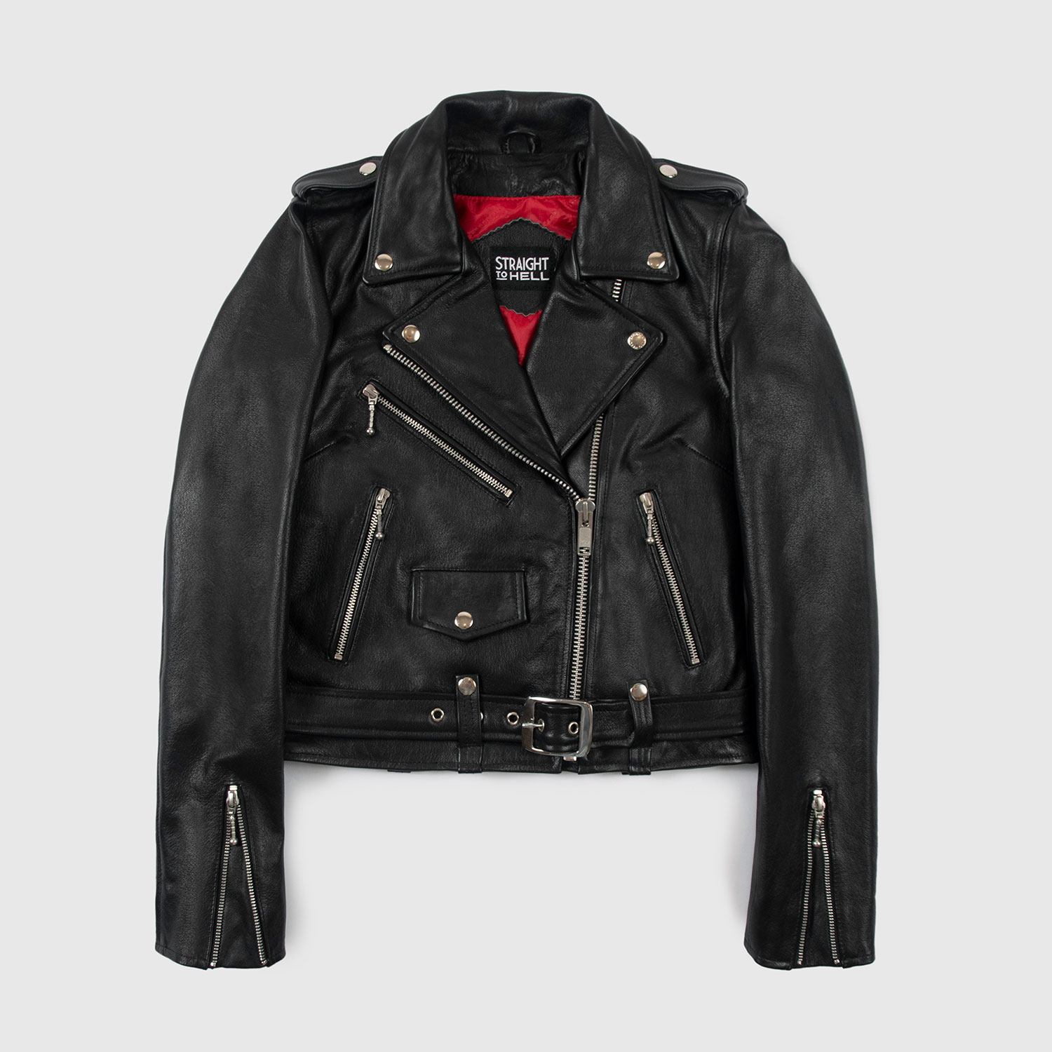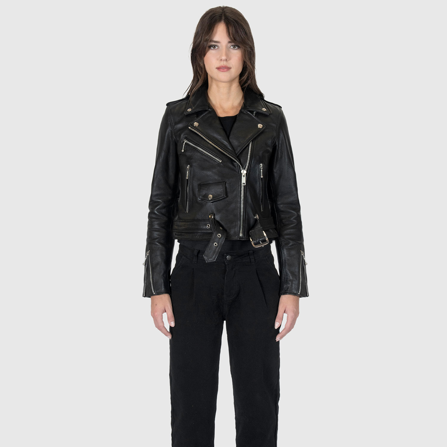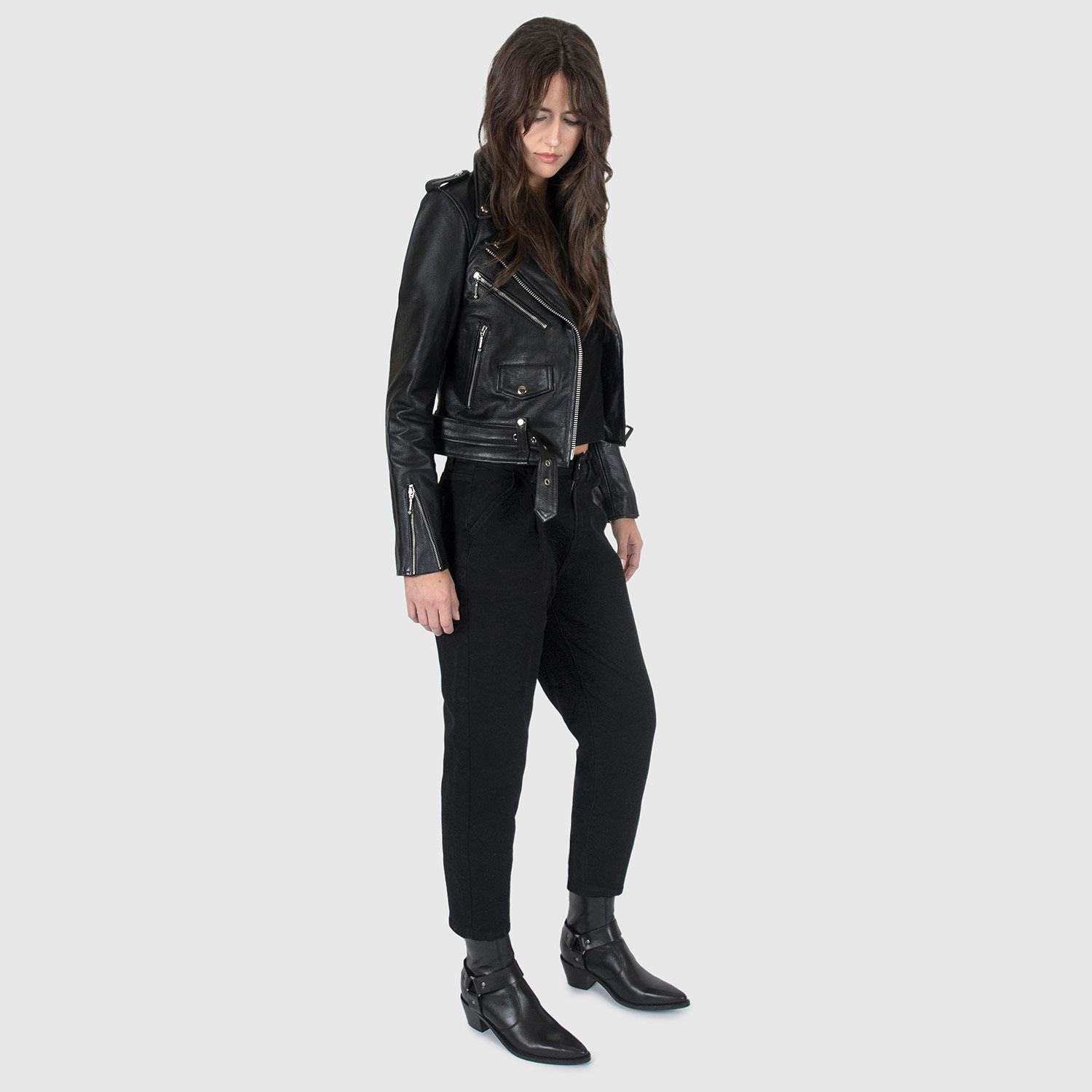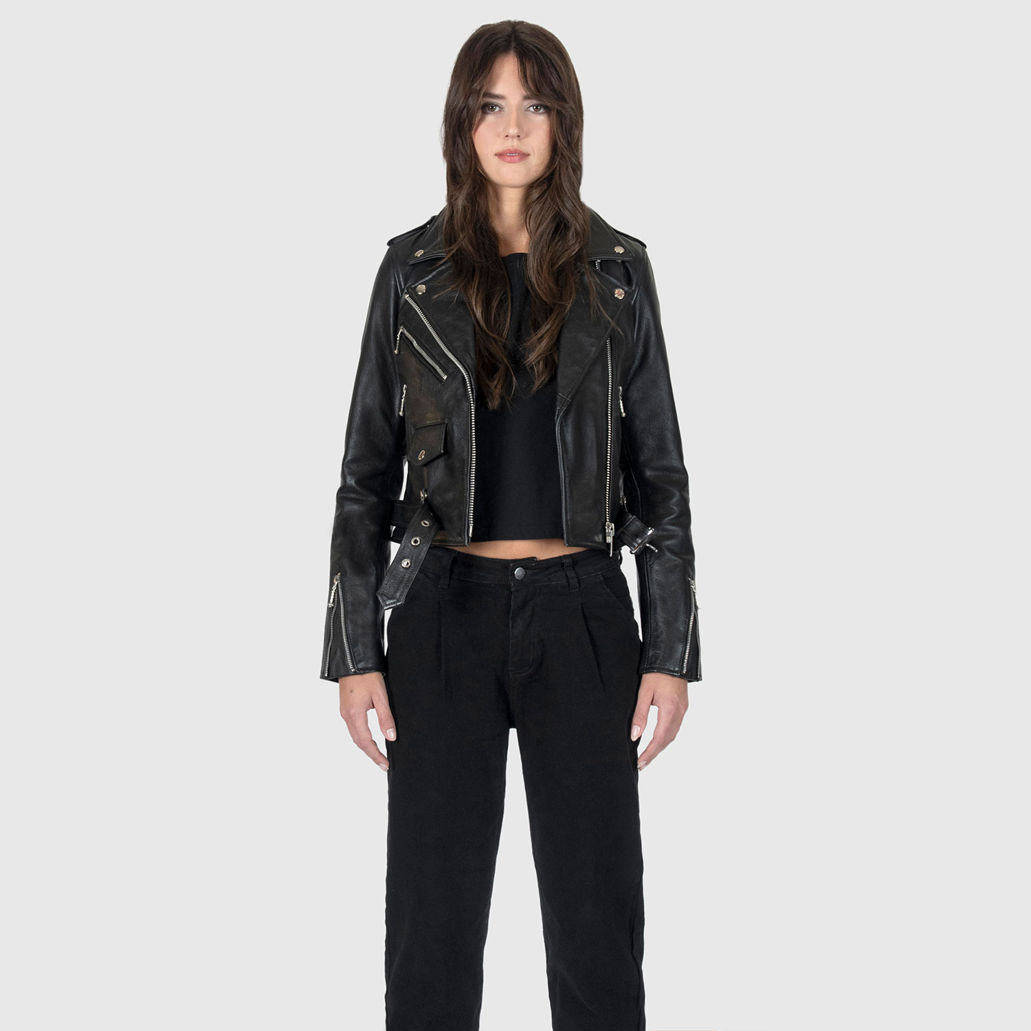 The Commando is our most traditional and recognizable leather jacket. The Commando Long features longer sleeves, ideal for tall women. Black leather with silver, ball pull zippers and redesigned, removable belt. Premium leather relaxes and conforms to your shape and breaks in perfectly. This is our new Modern fit.