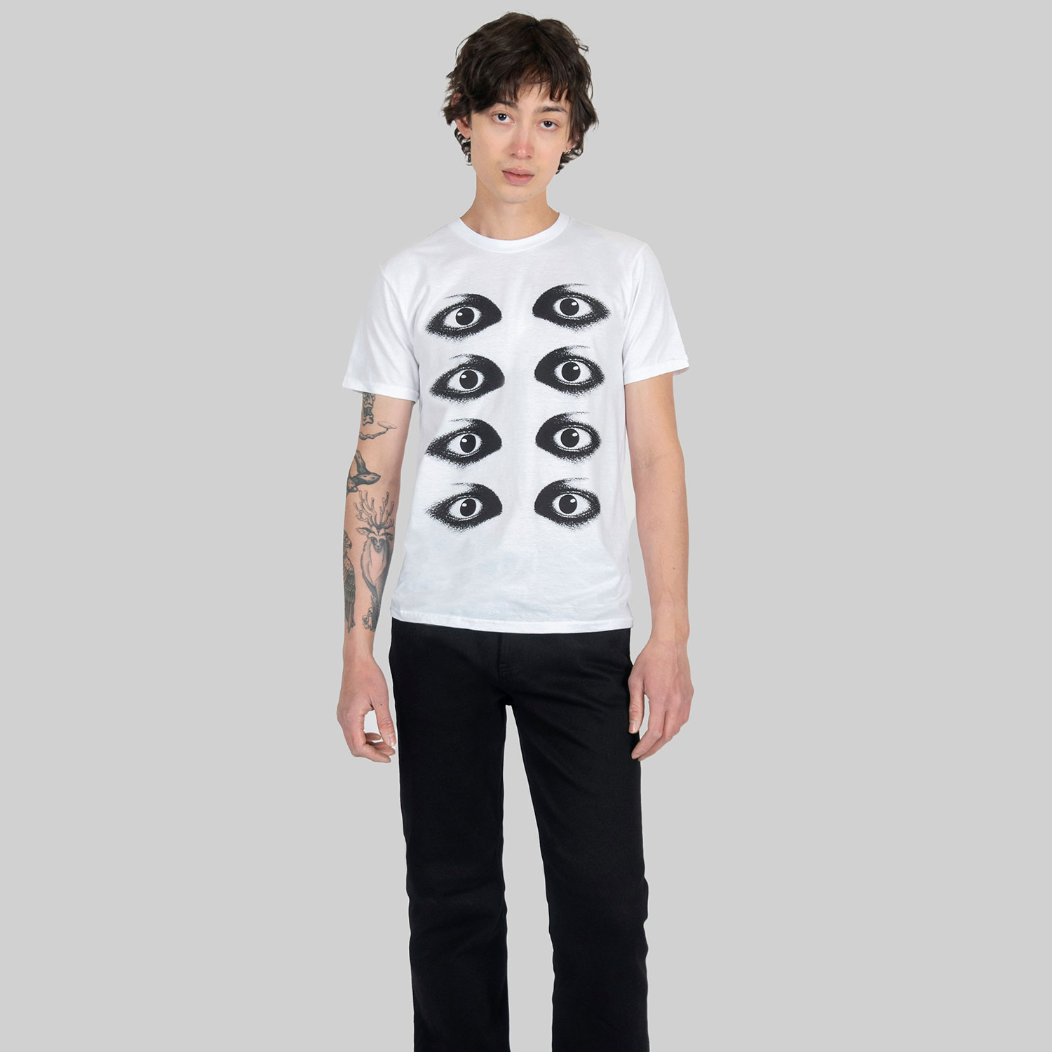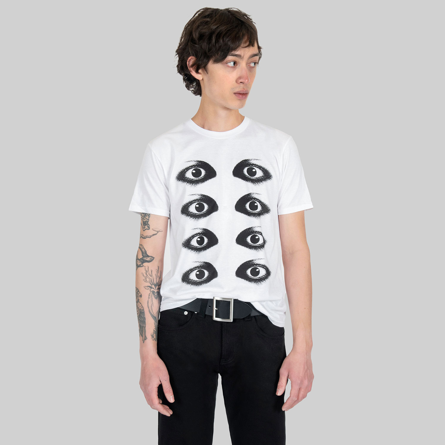 Eyes up here, buddy. This shirt doesn’t just sit there. It also looks back. Short sleeve eyes t-shirt made from soft cotton. Printed in Chicago. This is our Everyday fit.