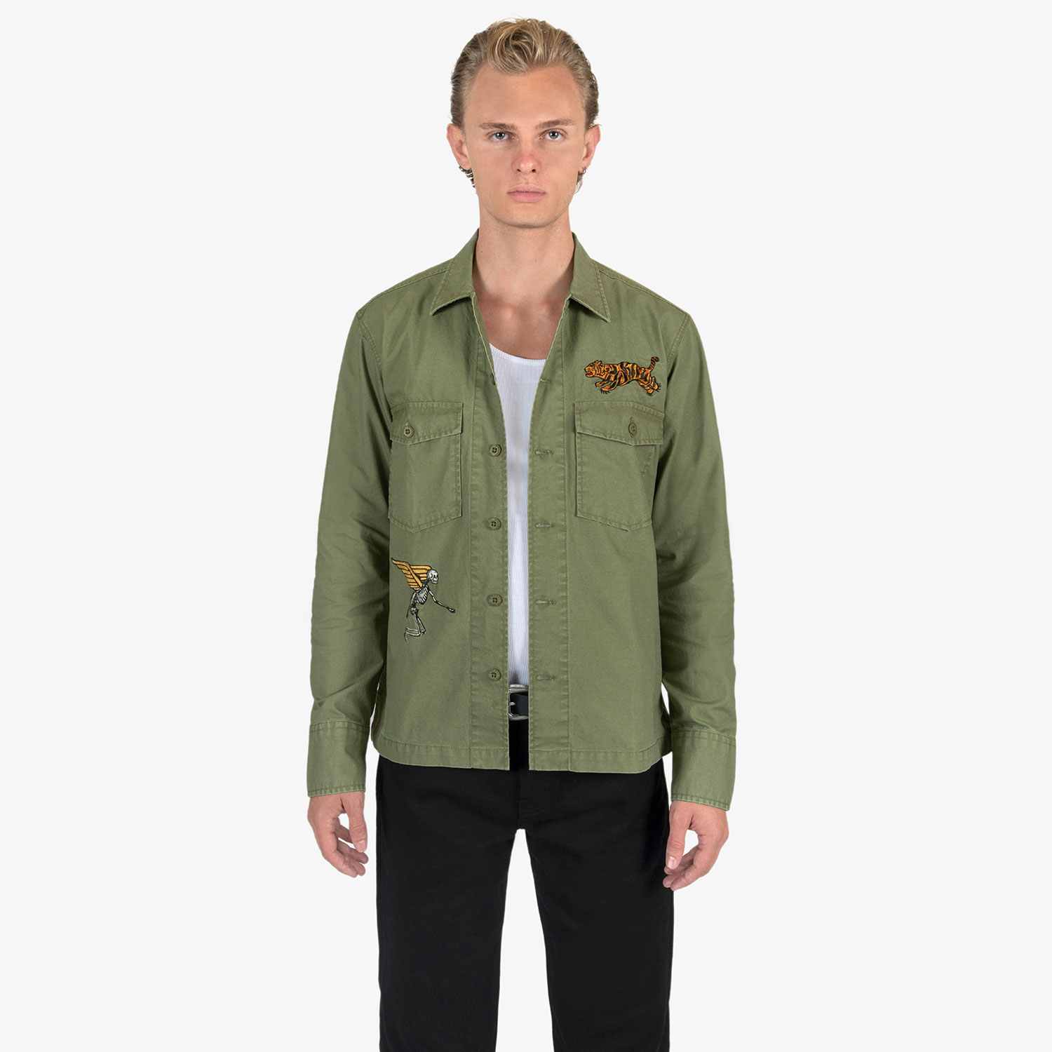 The Flying Tiger is a vintage-inspired shirt with tiger and winged skeleton embroidery and large chest pockets. The cotton fabric has been treated for a worn-in, vintage look and feel. It can be worn as a long-sleeve shirt or open as a jacket. The main label is influenced by vintage military shirt labels. This is our new True fit.