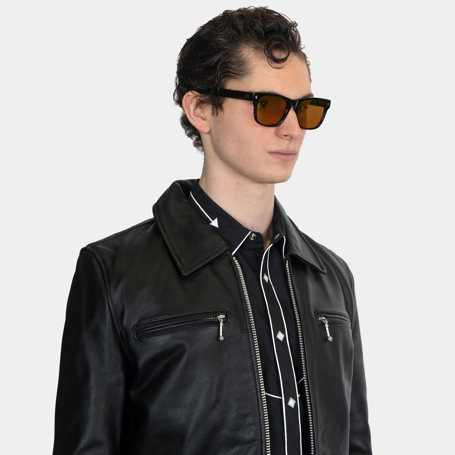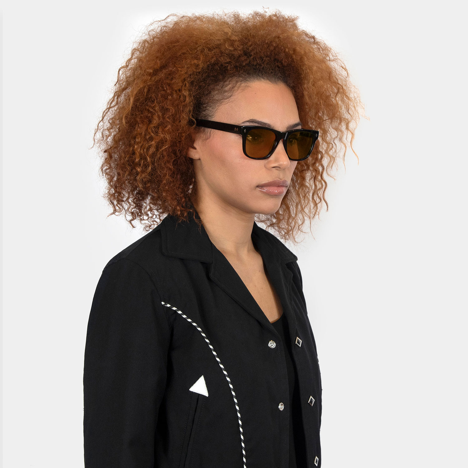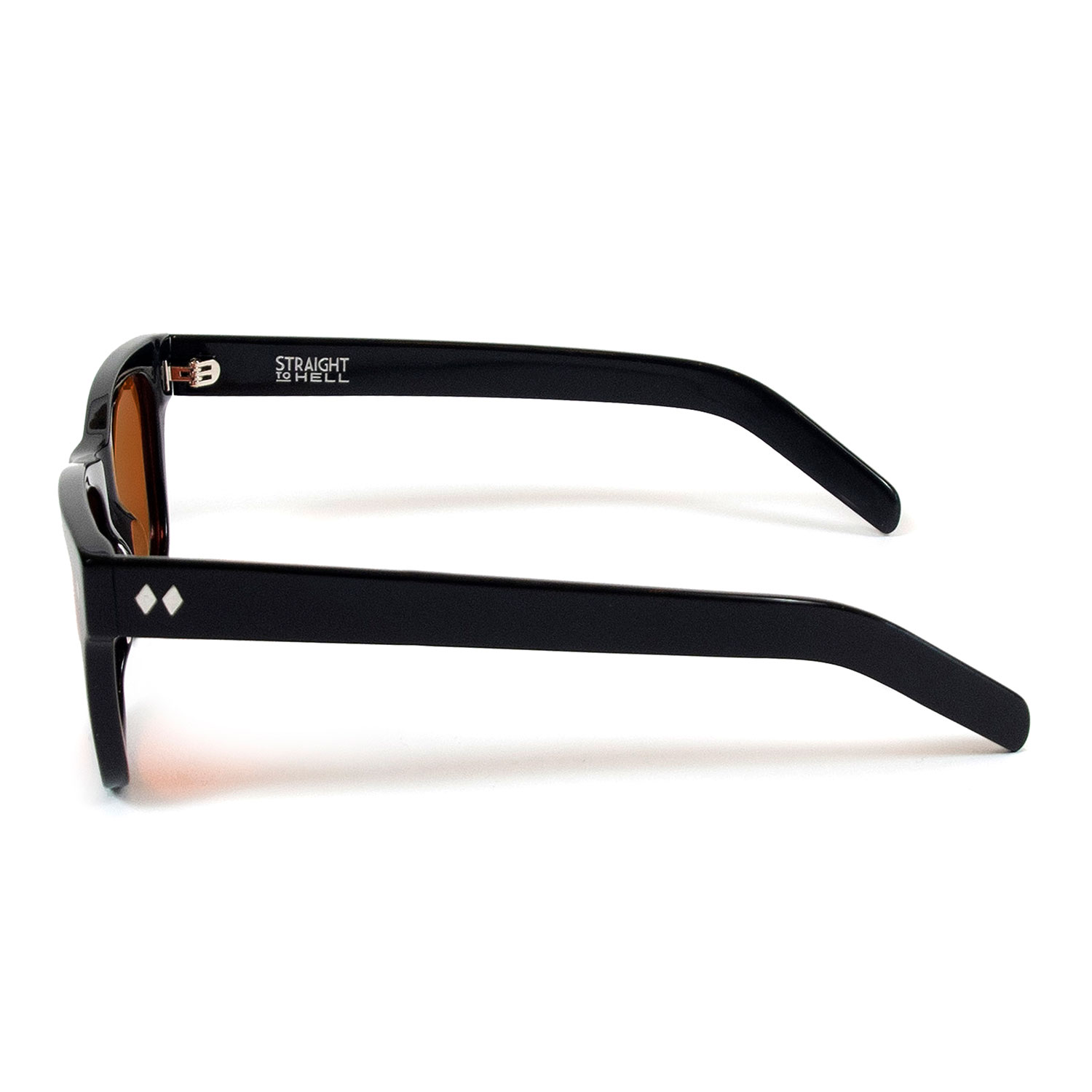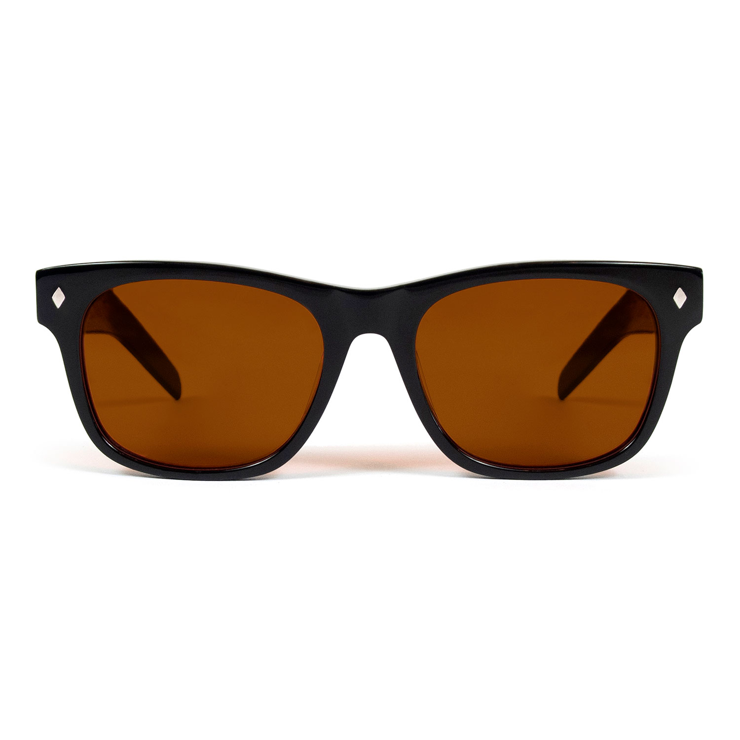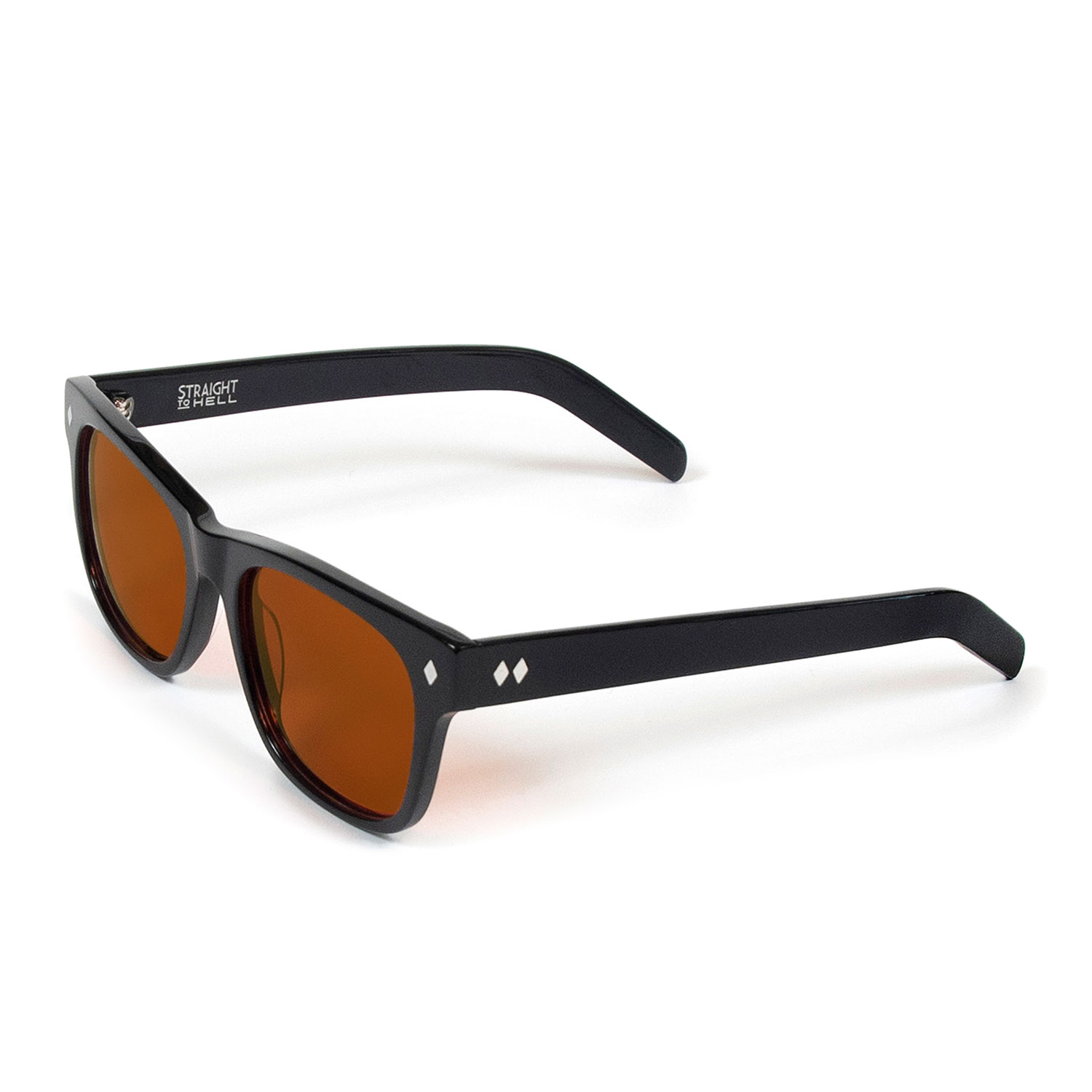 A classic sunglasses shape. Slightly retro, always cool and timeless. Hand-crafted, black acetate frames with polarized, dark orange lenses.