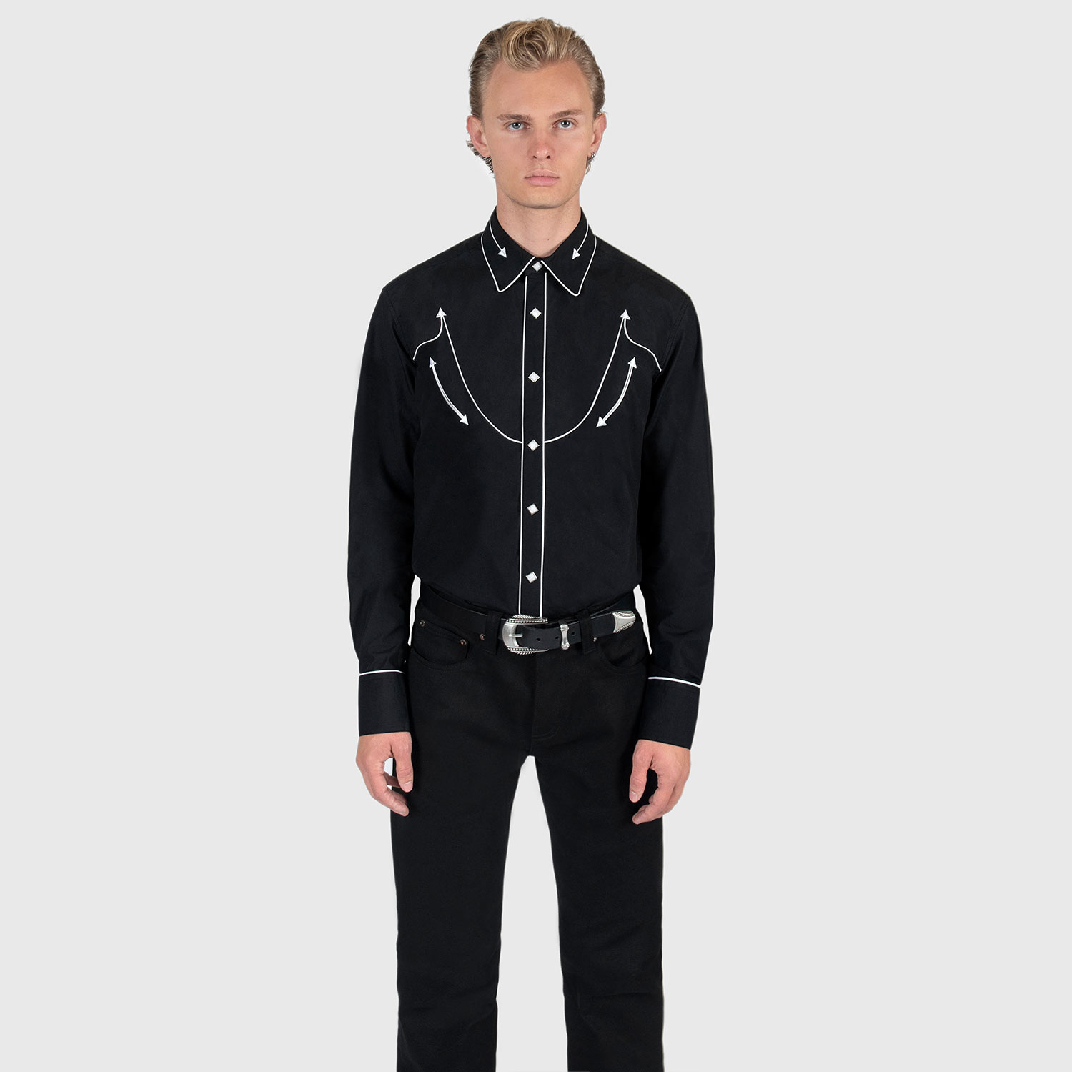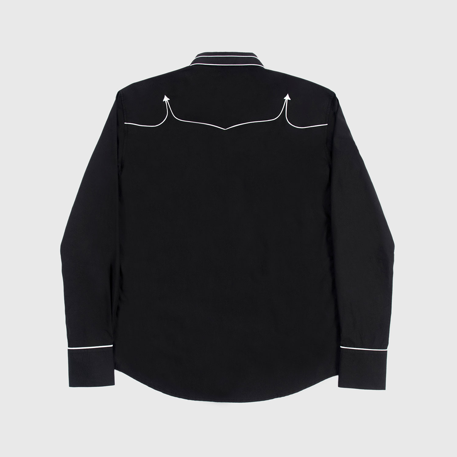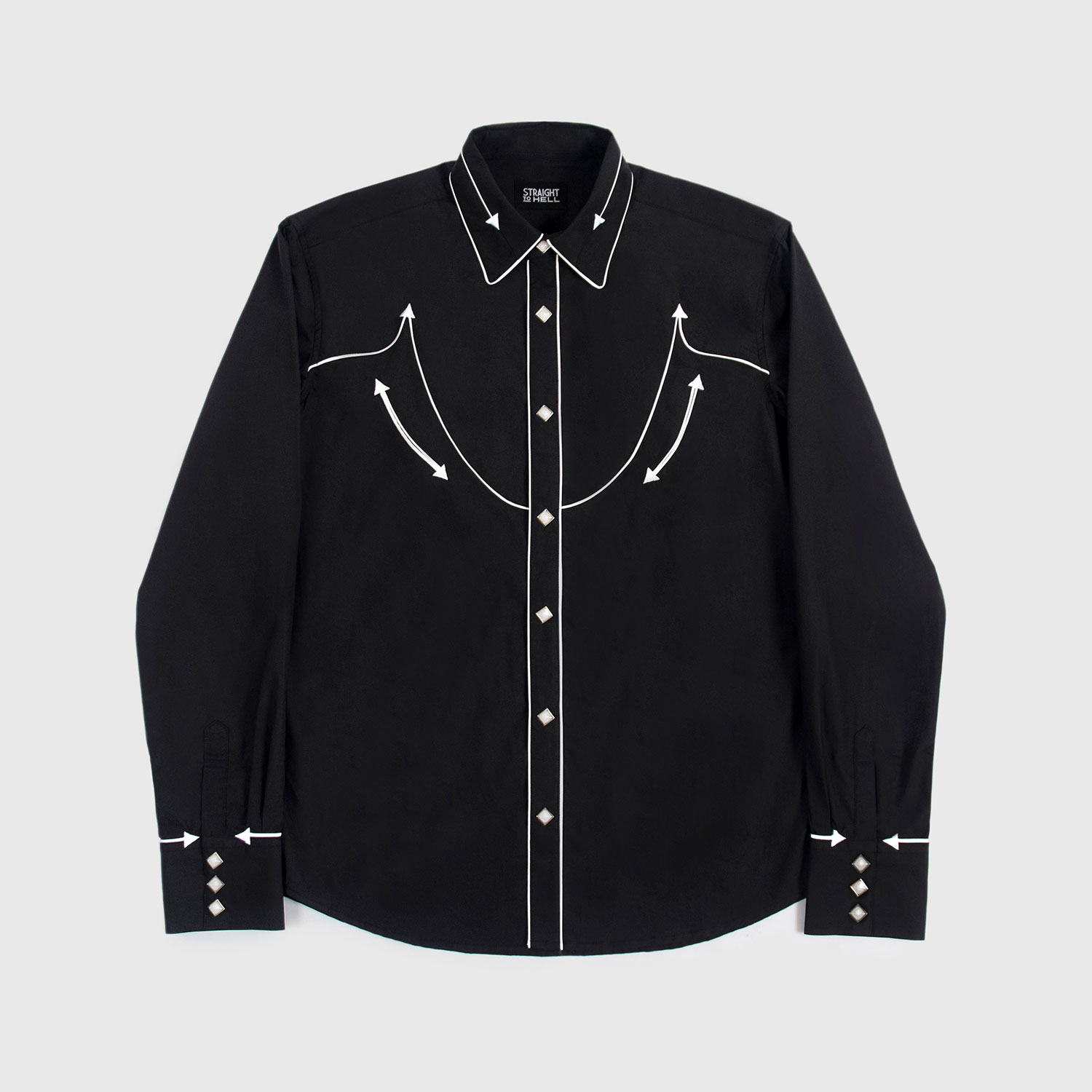 The Hillman is a black, long-sleeve western shirt. It features white piping detail, pocket arrow embroidery, and diamond snap closure. This is our new True fit.