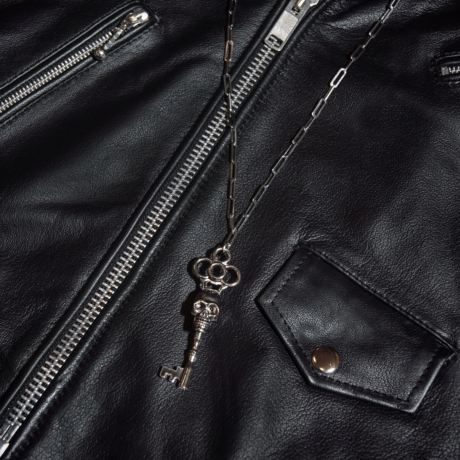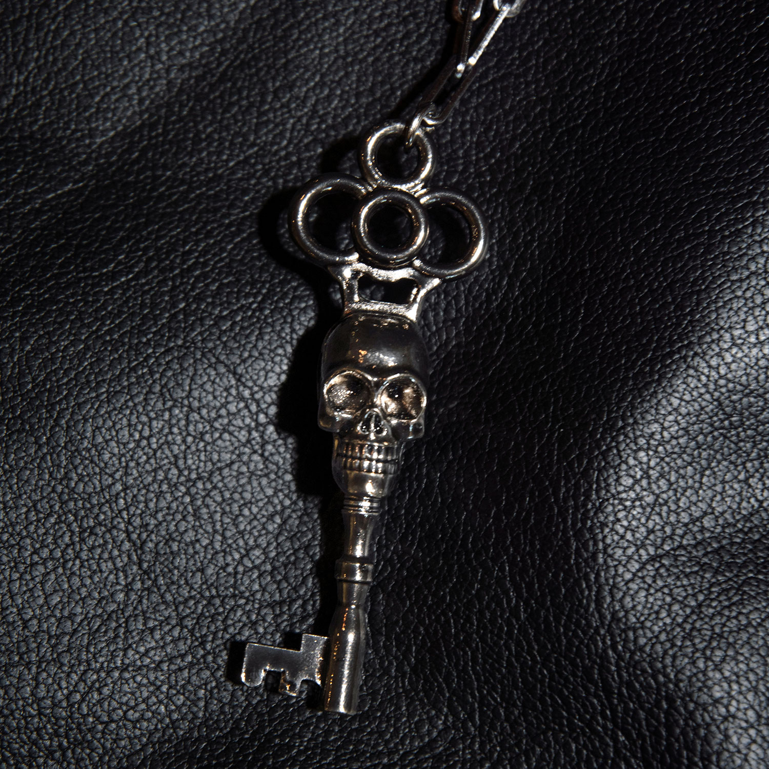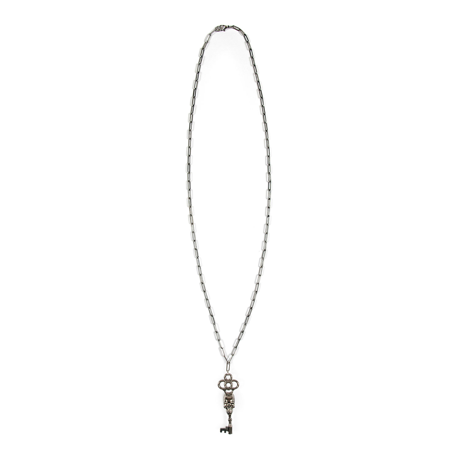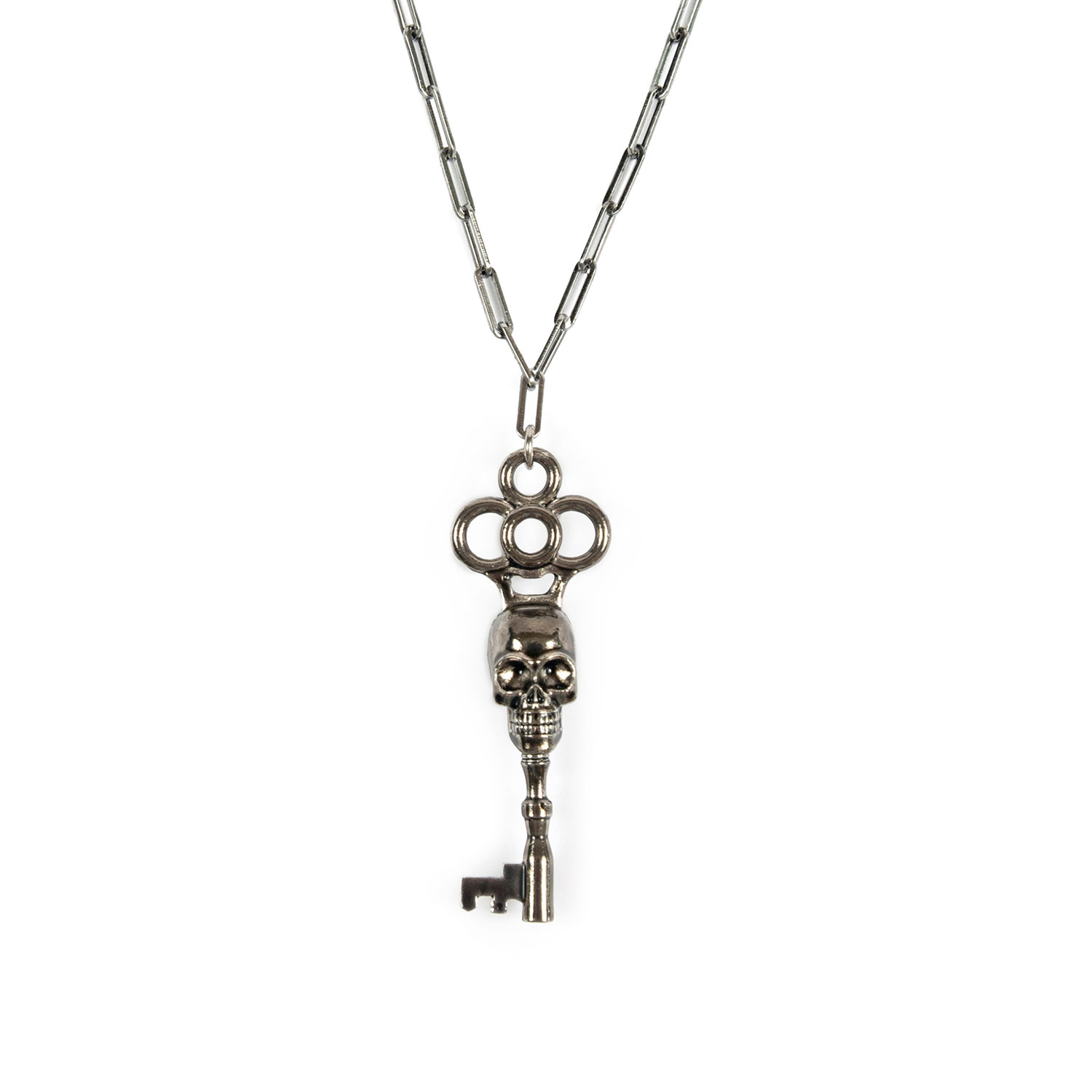 The Memento Mori is a silver-plated skeleton key necklace that hangs from a long, 18 inch stainless steel chain. The chain length can be adjusted for a shorter chain. The pendent is 3.25 inches tall. Packaged in an STH custom box.