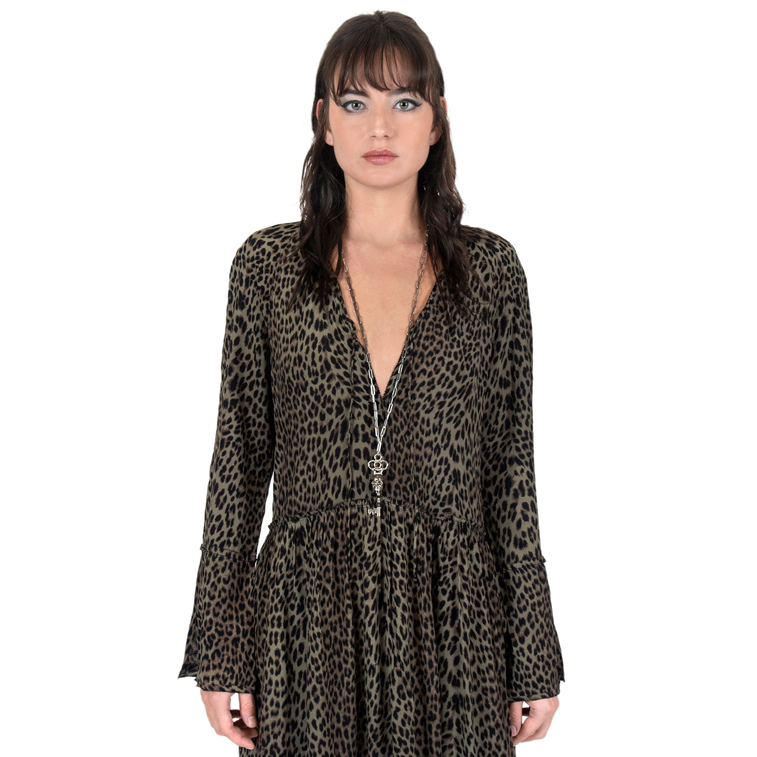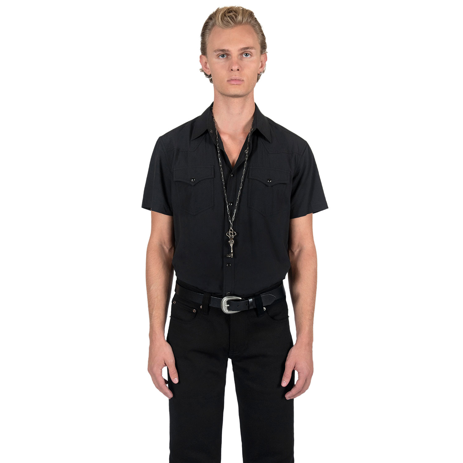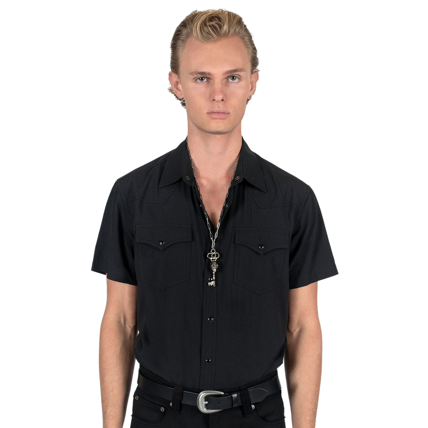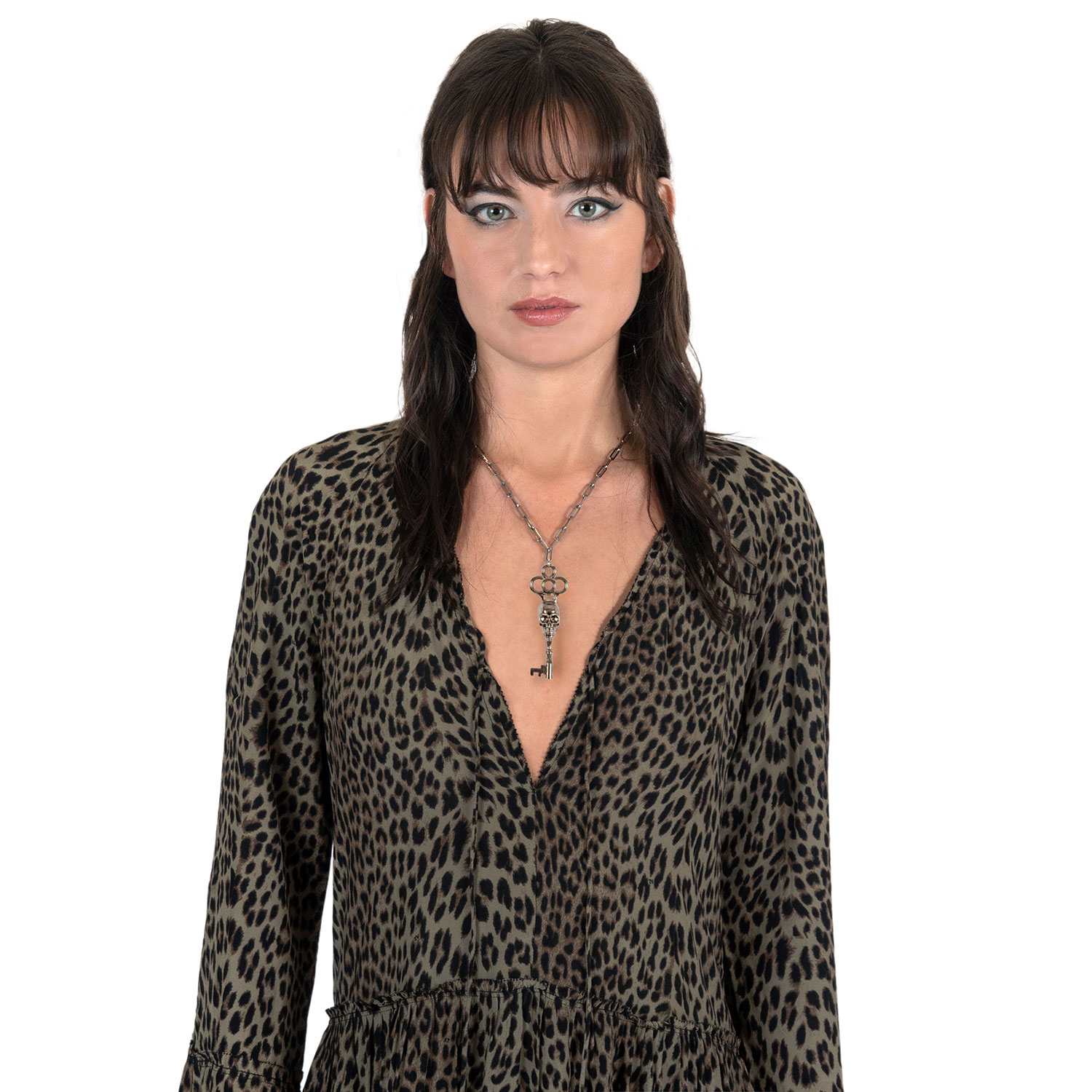 The Memento Mori is a silver-plated skeleton key necklace that hangs from a long, 18 inch stainless steel chain. The chain length can be adjusted for a shorter chain. The pendent is 3.25 inches tall. Packaged in an STH custom box.
