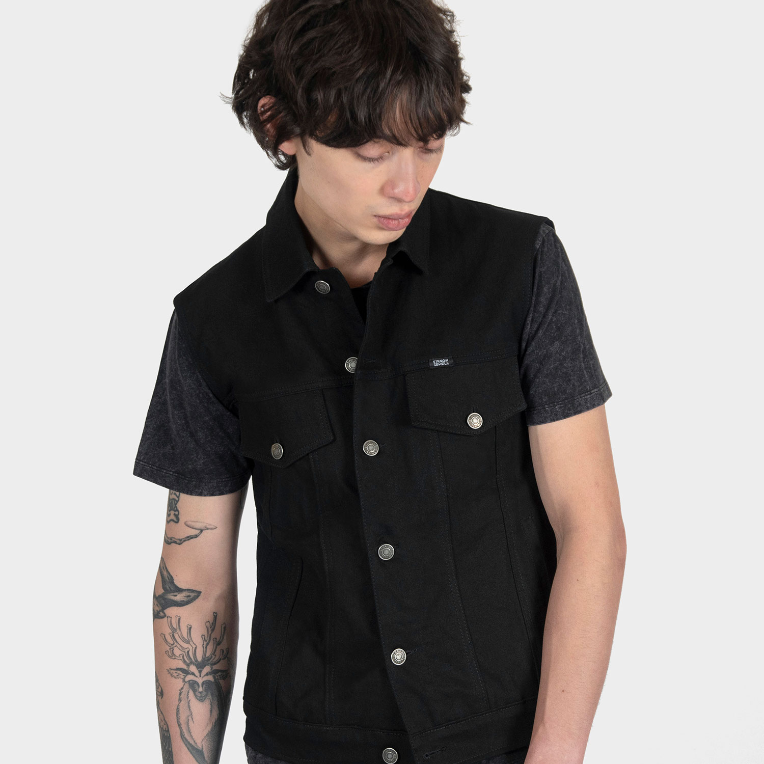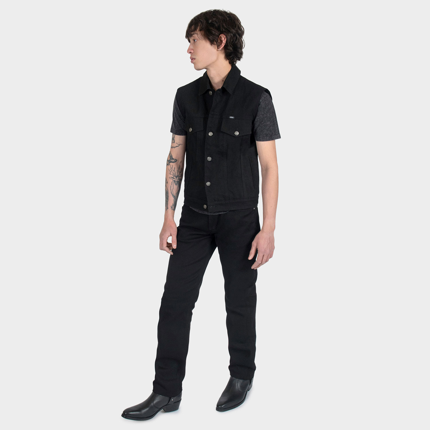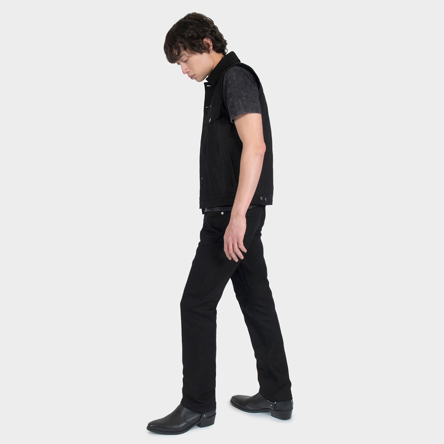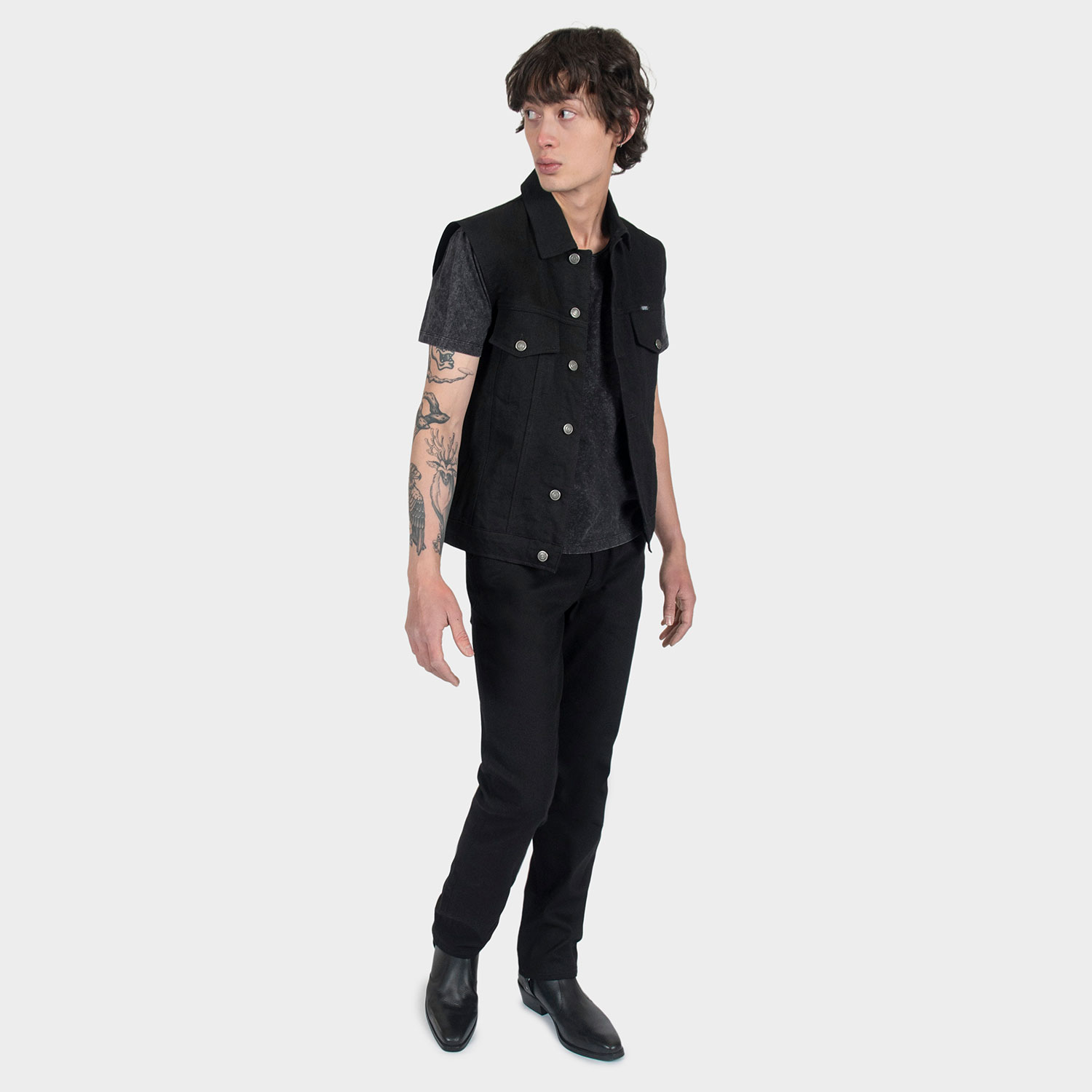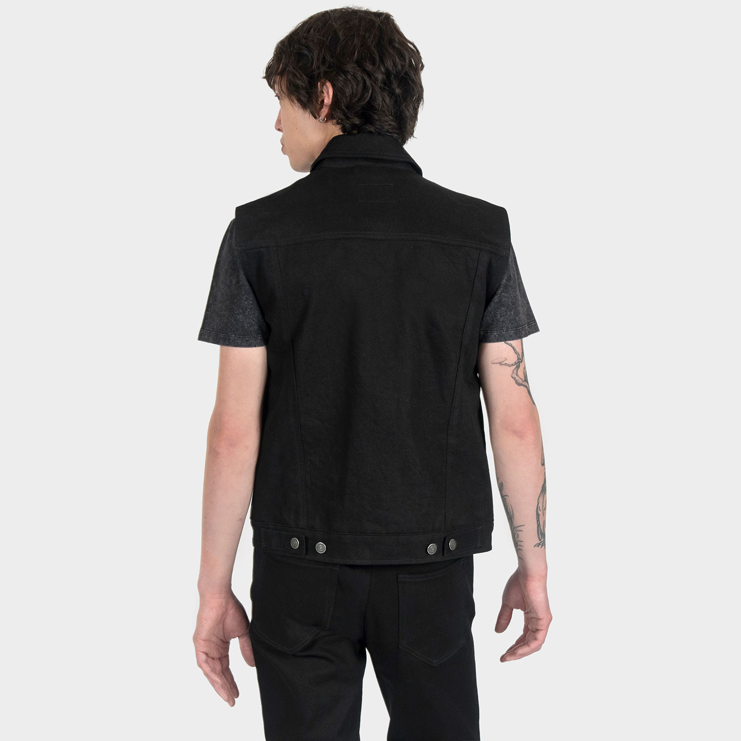 The Outsider Vest is made from our New Dawn premium cotton twill. 12.5 oz. fabric, custom button closure, and 2 inside pockets. Narrow shoulders compared to the Outsider jacket to prevent denim from hanging over the shoulder.