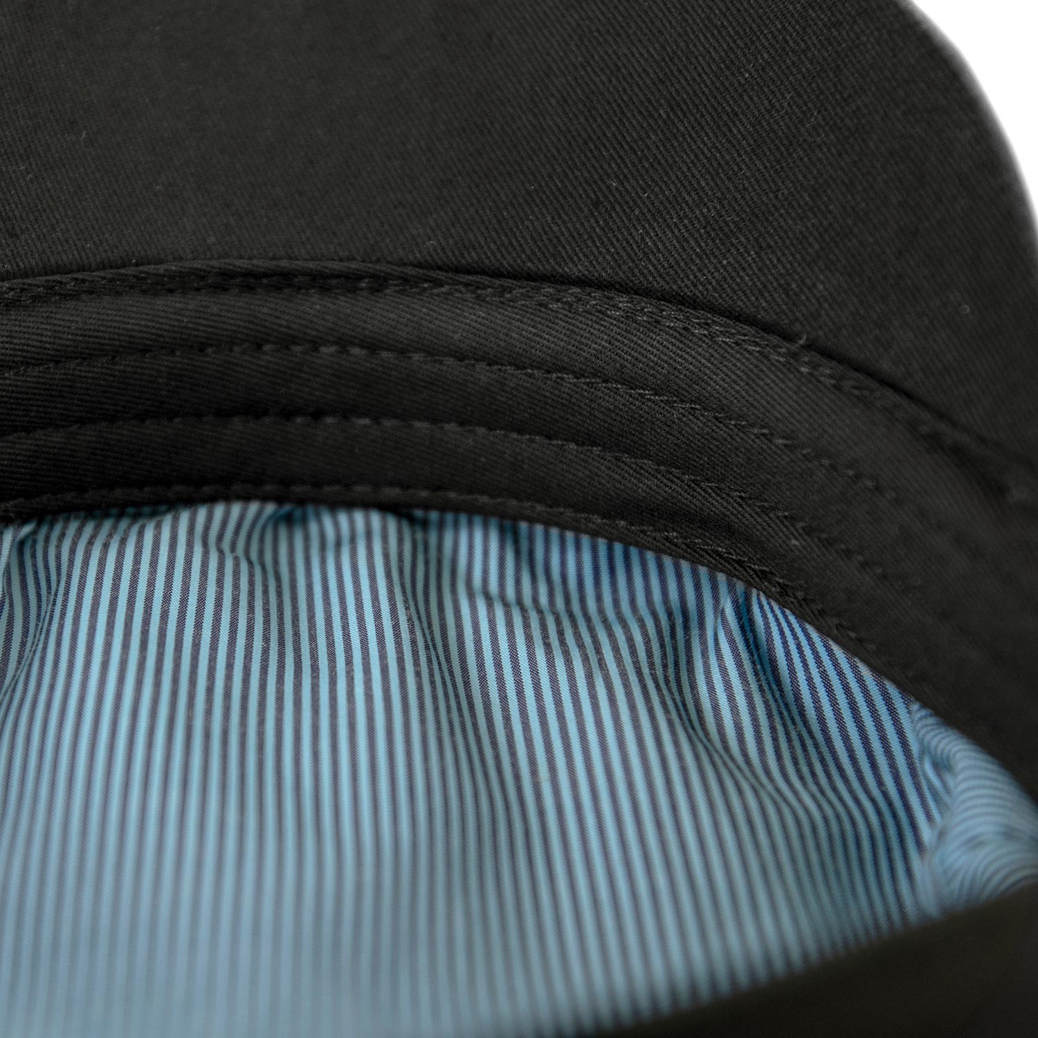 Twill fisherman hat with custom hardware, nylon rope, and striped lining. Hat features a light plastic band inside to hold the round shape.