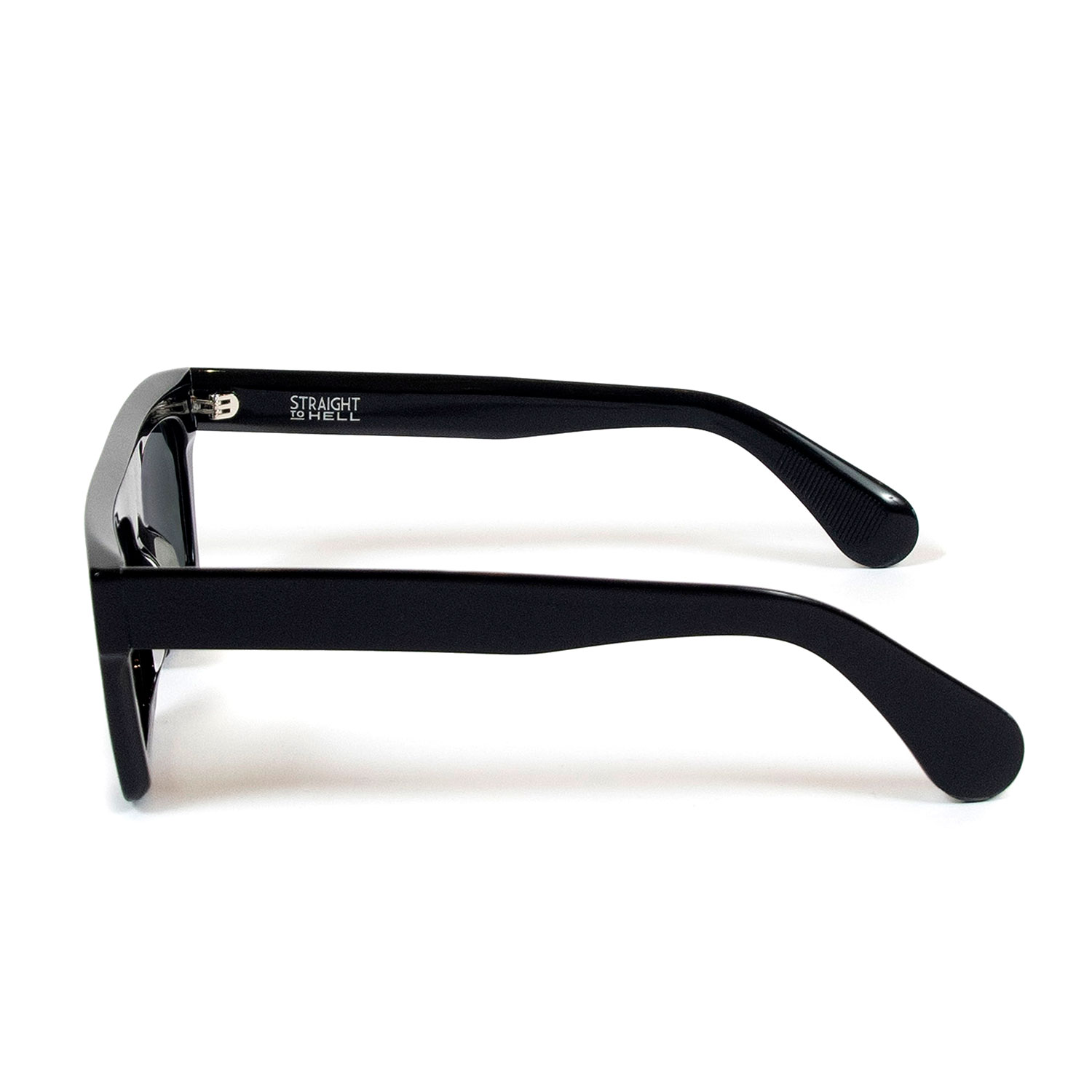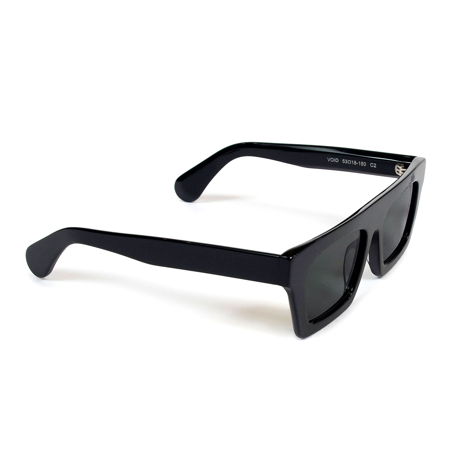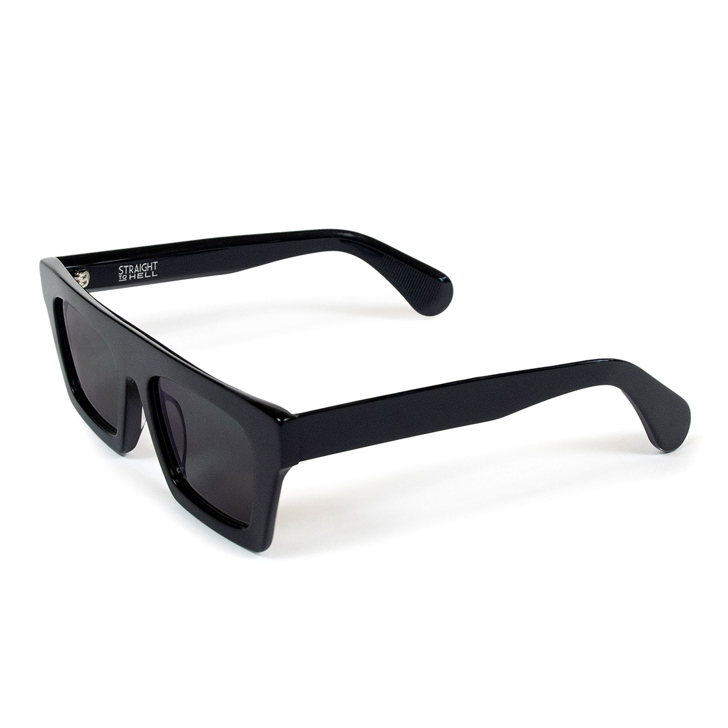 The Void sunglasses are sleek and modern with sharp angles. Hand-crafted, black acetate frames.