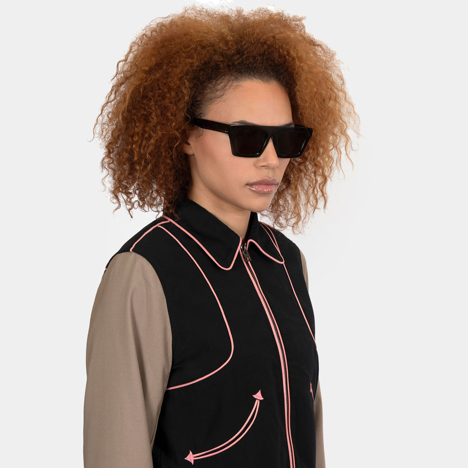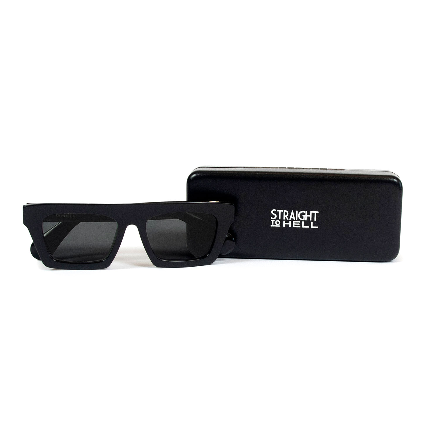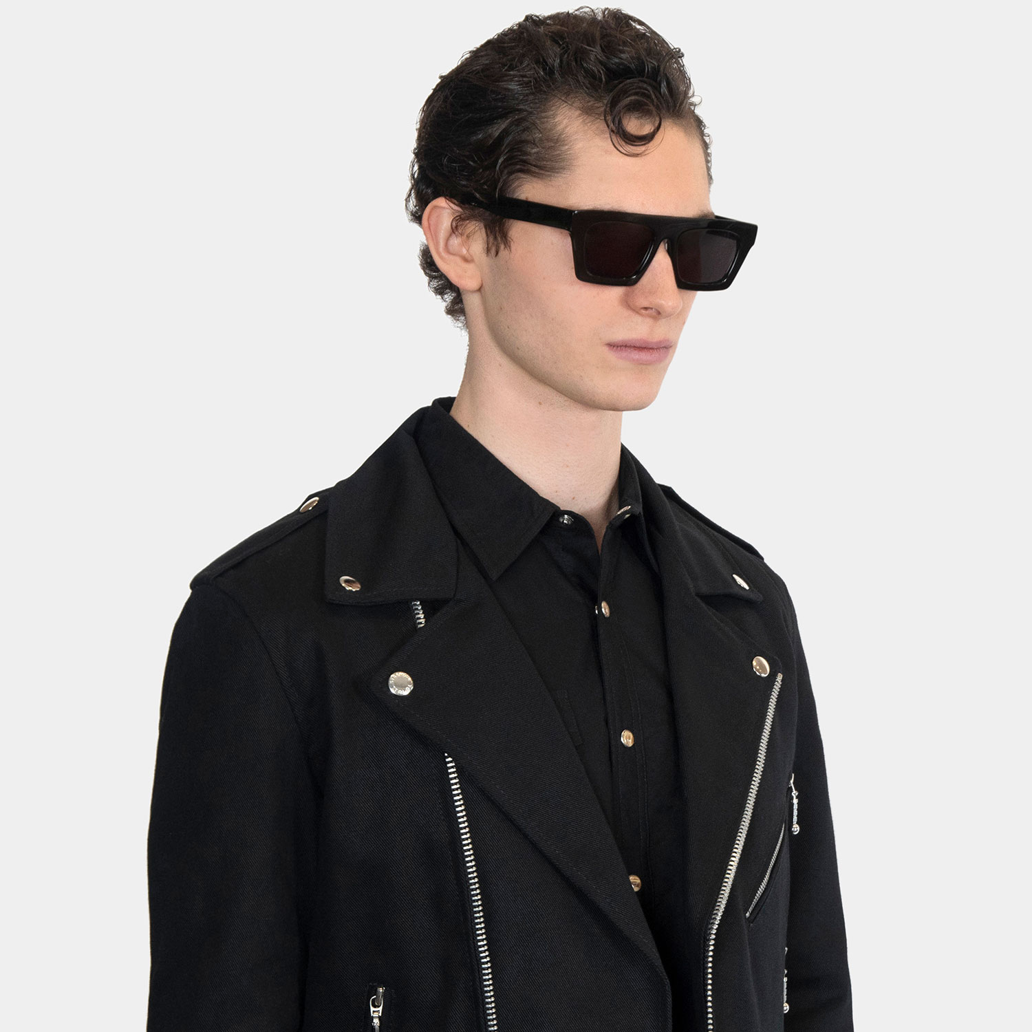 The Void sunglasses are sleek and modern with sharp angles. Hand-crafted, black acetate frames.